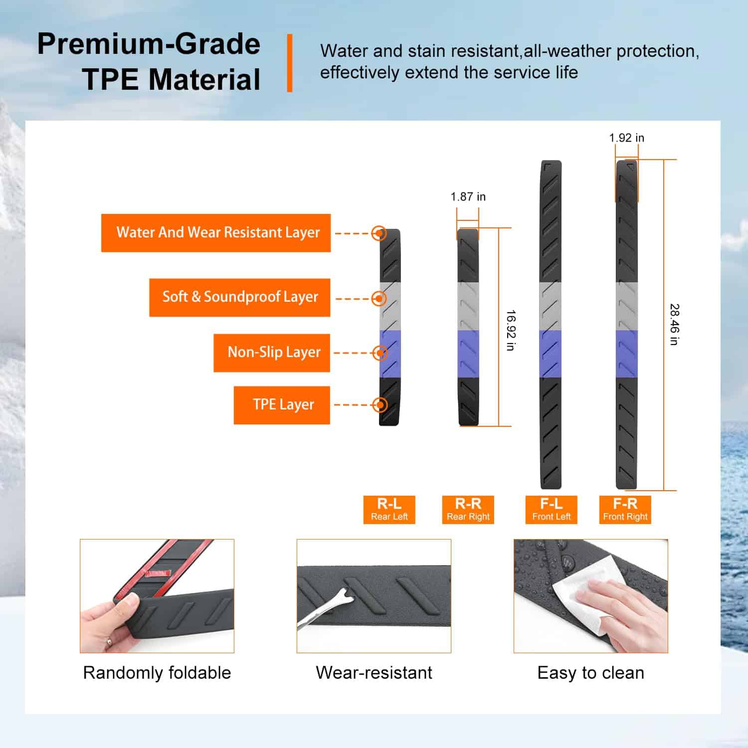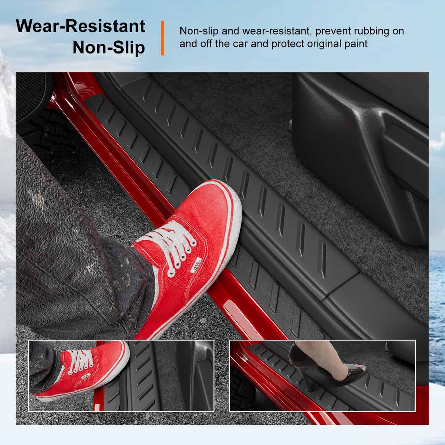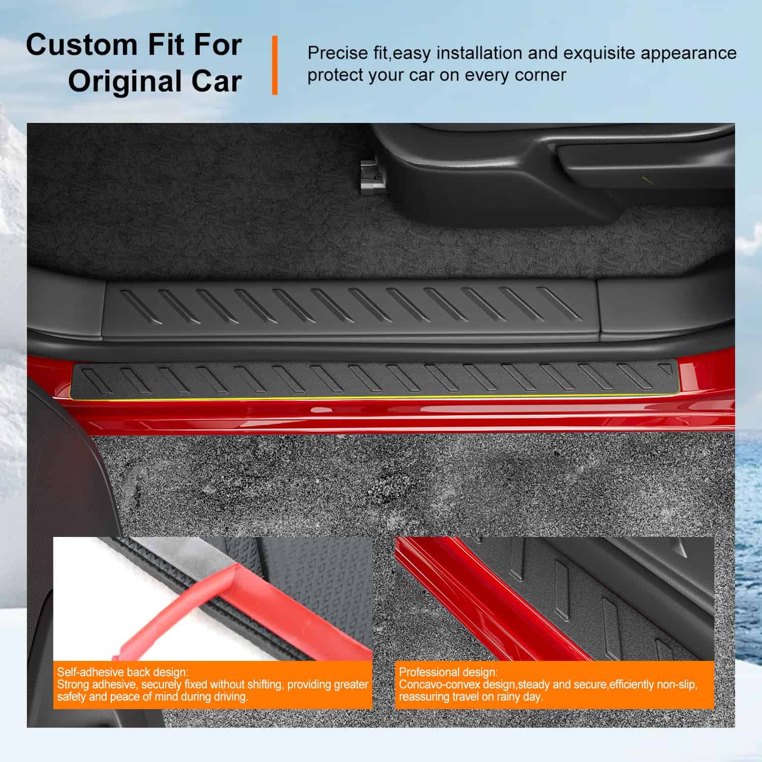 2. Material de Alta Calidad: Los protectores de umbral de puerta de Chevy Colorado 2023-2025 están hechos de material TPE de alta calidad. Es resistente a los arañazos, flexible y no tiene mal olor. Está diseñado de acuerdo con los datos originales de la puerta del coche, por lo que el ajuste es extremadamente alto. El diseño cóncavo y convexo es más antideslizante y suave. Puede resistir eficazmente la presión, fricción y desgaste del uso diario.