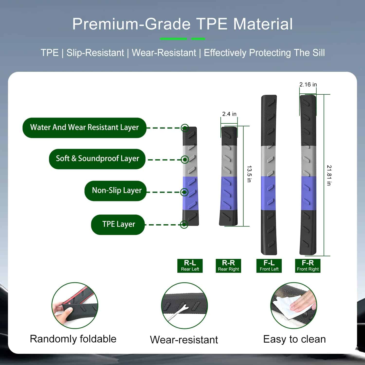 2. Material premium TPE: Nuestro protector de entrada de puerta compatible con Chevy Equinox está fabricado con material TPE, los protectores combinan absorción de impactos con flexibilidad, resistiendo desgaste y fluctuaciones de temperatura. El material mantiene la integridad estructural en calor o frío extremo, evitando grietas o deformaciones. Las propiedades de absorción de impactos de TPE reducen el estrés en el adhesivo, extendiendo la vida del producto.