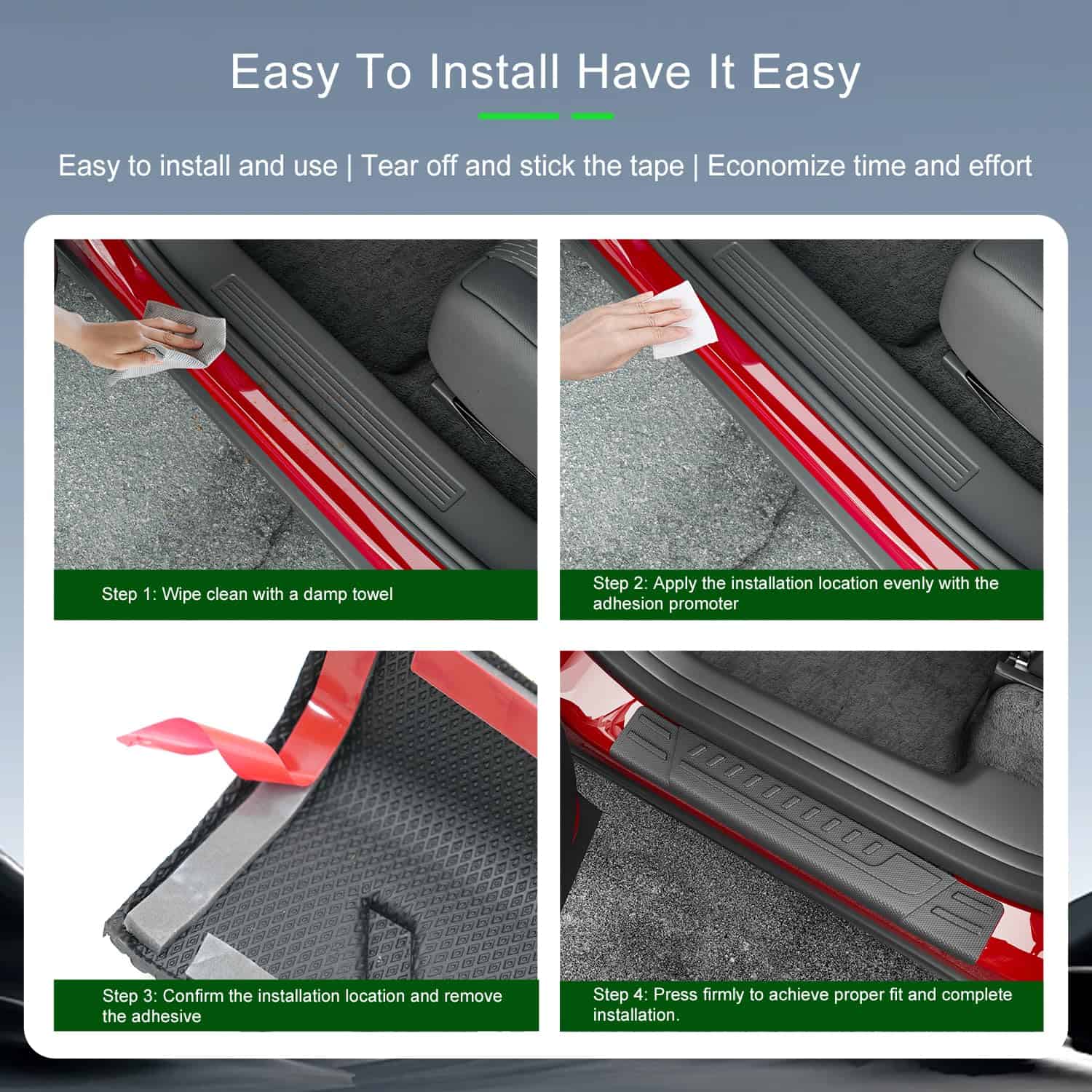 4. Fácil de instalar: El guardia de umbral de puerta compatible con Chevy Equinox viene con cinta de doble cara para que pueda pegarse directamente. Aquí hay dos consejos al instalar, que harán que se adhiera mejor. 1. La adhesividad es más débil cuando la temperatura es inferior a 10 (50 ), usar un secador de pelo para calentar la cinta adhesiva térmica será mejor. Después de que la instalación haya terminado, la cinta adhesiva funciona a baja temperatura. 2. Por favor, no tocar agua después de pegarla en las primeras 48 horas.