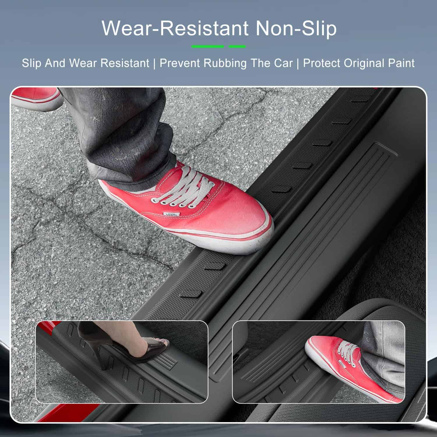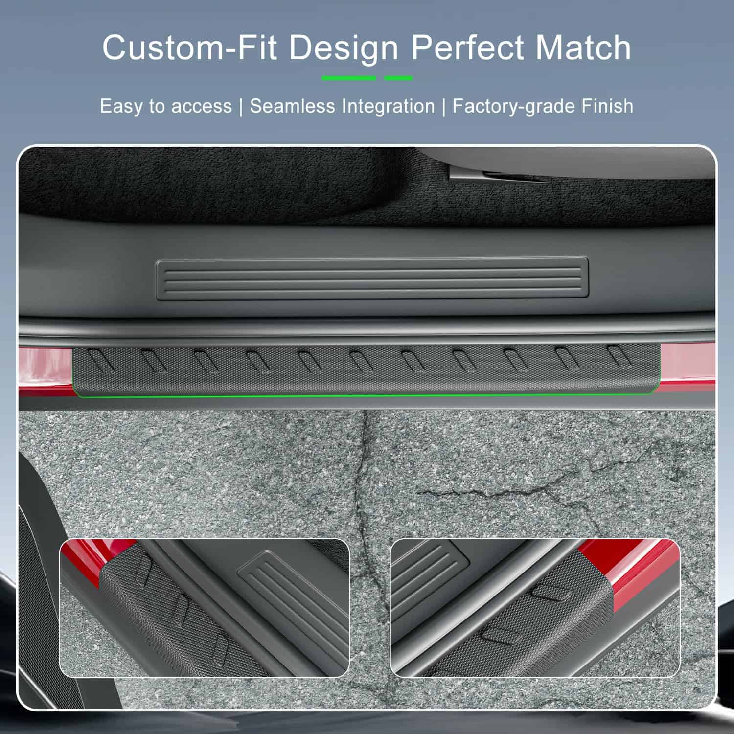 3. Diseño multifuncional: El reemplazo de protección de umbral de puerta para Chevy Equinox cuenta con un labio exterior elevado y un canal interno empotrado para desviar agua, barro y escombros lejos de las costuras de la puerta. Su superficie microtexturizada dispersa la fricción causada por el tráfico de pies, reduciendo eficazmente las rozaduras visibles. Los bordes reforzados brindan protección adicional contra impactos accidentales de herramientas, equipaje o garras de mascotas.