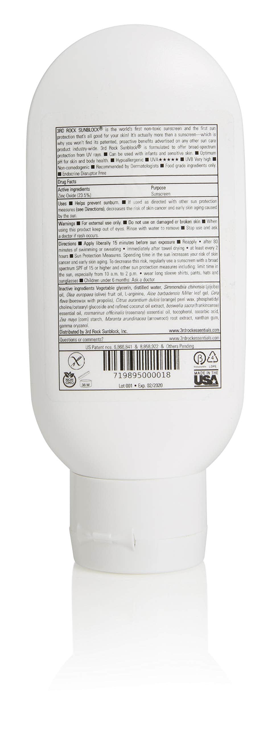 El Protector Solar 3rd Rock Essentials es el mejor y más seguro protector solar. Nuestro protector solar natural es orgánico, libre de químicos y utiliza ingredientes naturales para protegerte de los dañinos rayos solares. No utilizamos disruptores endocrinos, parabenos ni toxinas. Nuestro Protector Solar de Óxido de Zinc Natural es el mejor protector solar orgánico y libre de químicos disponible. Formulado exclusivamente con ingredientes de grado alimenticio, previene el daño a la piel causado por el sol y compuestos tóxicos. Ofrece la protección UVA y UVB más robusta de todas las marcas de protector solar. Resistente al agua y al sudor máximo, hipoalergénico y aprobado por PETA y Leaping Bunny. Disponible en Aromaterapéutico, Sin Fragancia e Infantil. La fórmula del protector solar de óxido de zinc SPF 35 está formulada exclusivamente con ingredientes de grado alimenticio, evitando el daño celular causado por los rayos UVA y UVB.