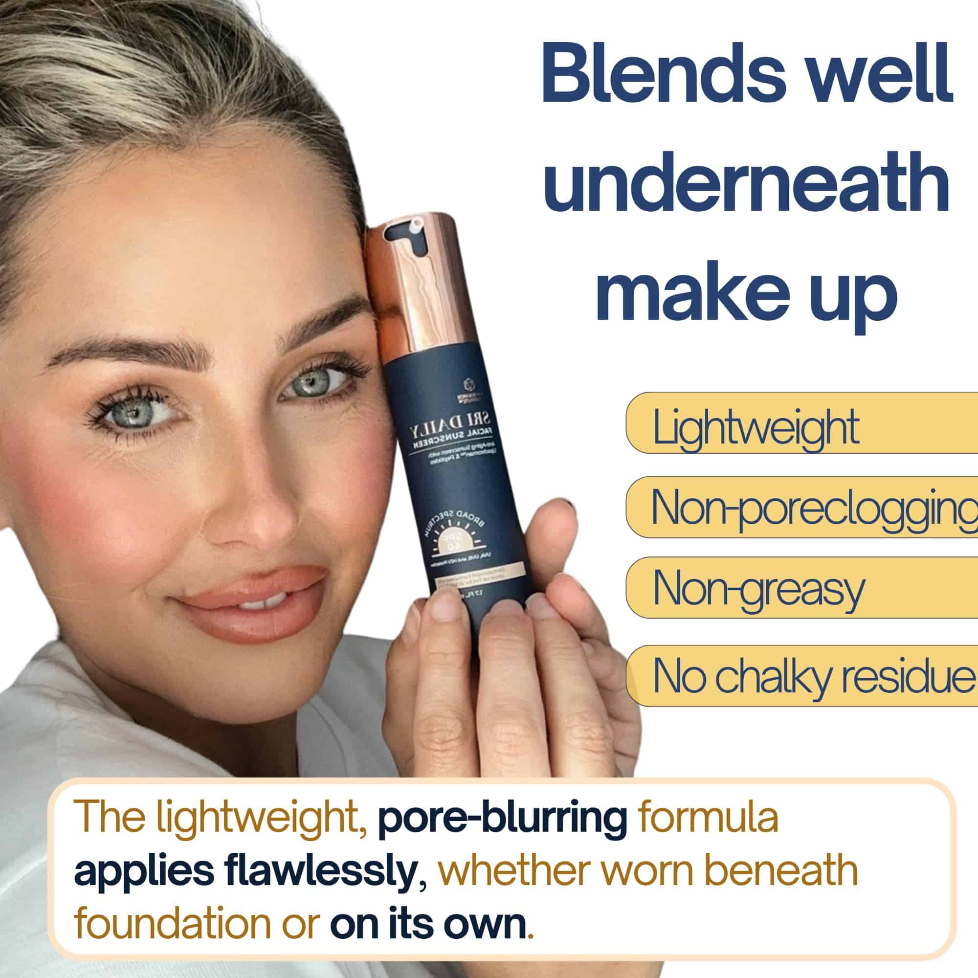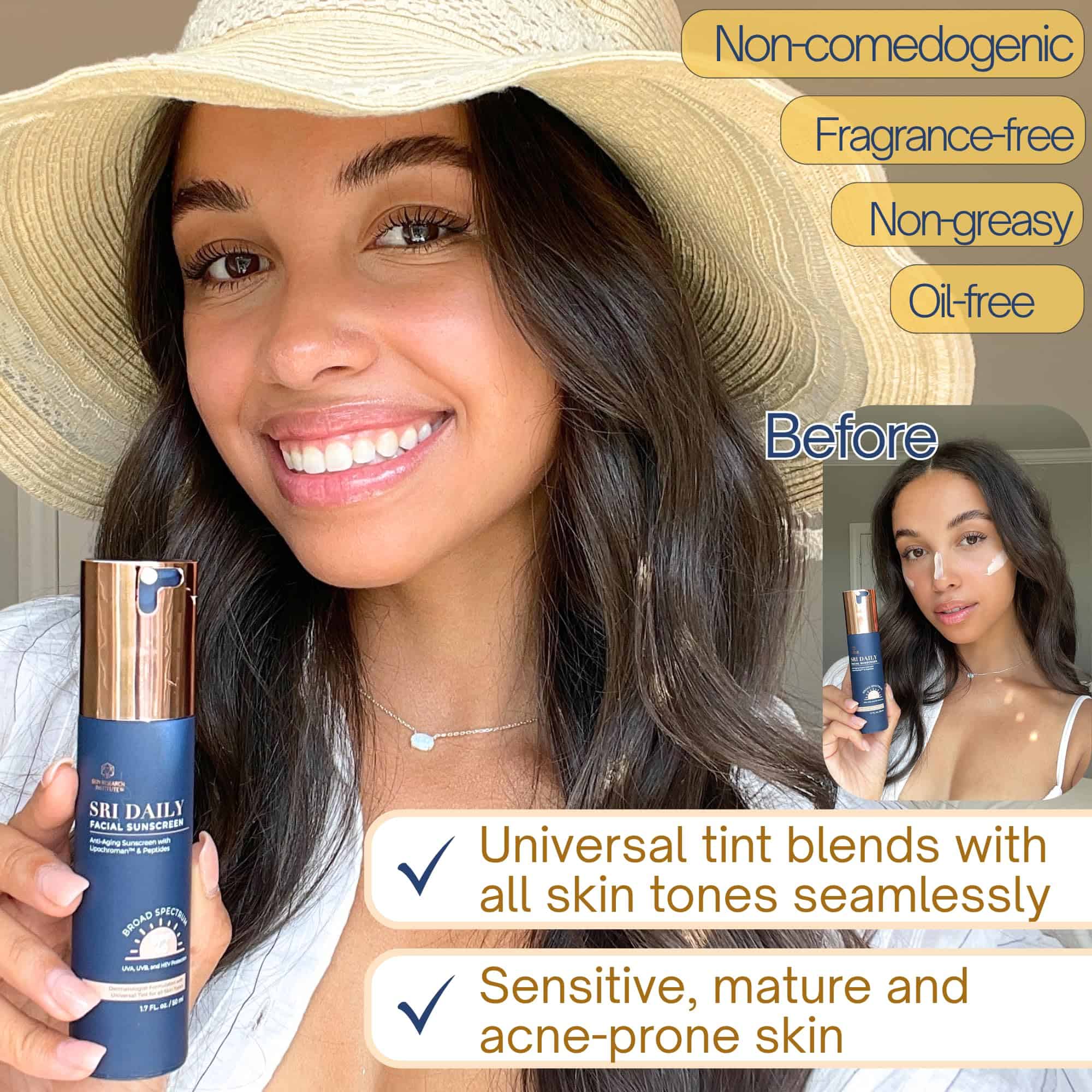 Protector Solar Facial Diario SRI es una fórmula universal con tinte ligero que proporciona protección suave y libre de aceite para todo tipo de piel, tonos de piel y estilos de vida. Es un cambio de juego para cualquiera que lo pruebe. Los productos de calidad médica contienen ingredientes de mayor calidad, que deben ser 99% puros. En contraste, los productos comprados en Sephora, tiendas de comestibles o en línea no están sujetos a estos mismos estándares estrictos. Contiene Lipochroman, un potente antioxidante que protege la piel de tres clases de radicales libres. Estudios in vitro muestran que ayuda a recuperar la elasticidad y mejorar la apariencia de arrugas y manchas oscuras de la piel. Con 8% de óxido de zinc transparente, proporciona protección contra los rayos UVB que pueden causar quemaduras solares y cáncer de piel, y los rayos UVA que contribuyen al cáncer de piel y al envejecimiento prematuro. El óxido de zinc también ayuda a calmar la piel que ya está enrojecida, irritada y/o dañada por el sol. Formulado por dermatólogos, es adecuado para todo tipo de piel, incluida la piel sensible. Es una fórmula no comedogénica y libre de aceite que es suave con tu piel. Producido en Miami, Florida.