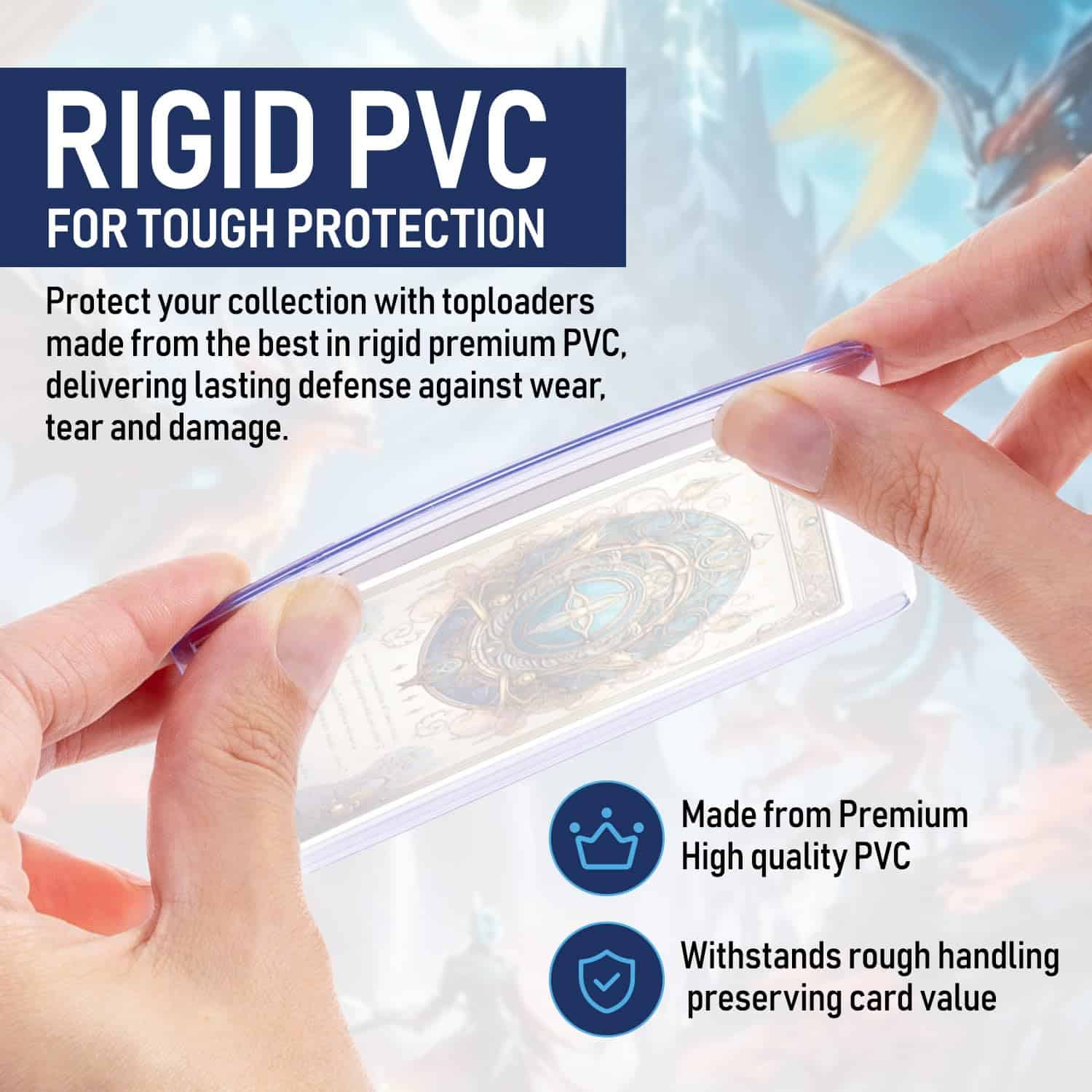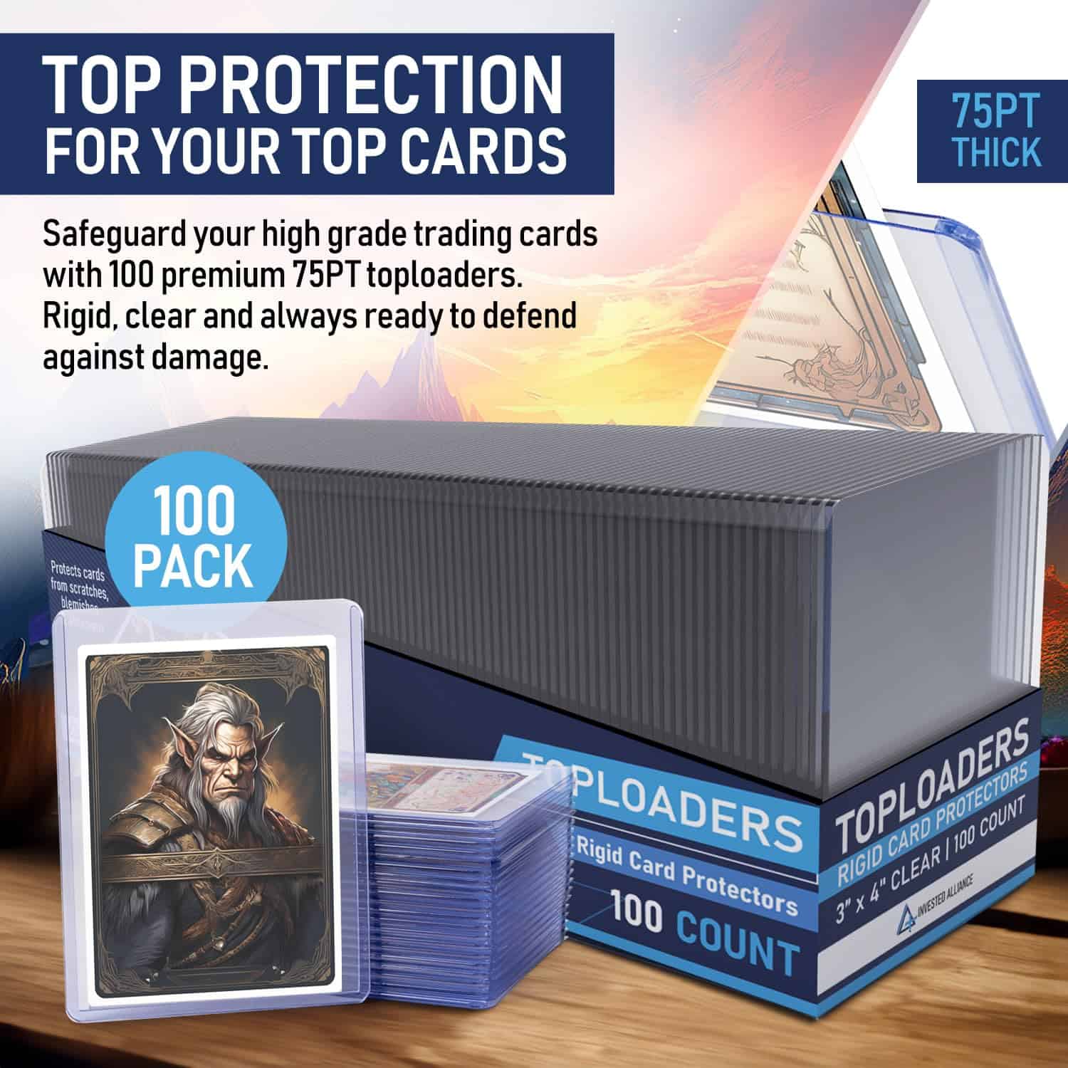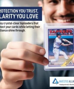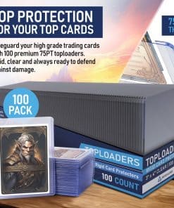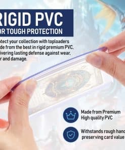 Los Top Loaders de 75PT de Invested Alliance vienen en paquetes de 100 unidades y protegen todas tus cartas favoritas de Magic The Gathering, Dragon Ball Z, Kpop, Baseball, Fútbol y otros deportes. Nuestros protectores de cartas de trading premium están hechos con PVC transparente y rígido, que protege confiablemente tus cartas de juego de arañazos, manchas y abrasiones. Nuestros top loaders se abren por el lado corto y mantienen limpias tus cartas estándar de trading, gaming y deportes de hasta 75 pt de grosor. ¡Úsalos con nuestras fundas suaves de Invested Alliance para la máxima presentación de cartas! Haz clic en ‘añadir al carrito’ para proteger tus cartas de colección. ¡Nos lo agradecerás!