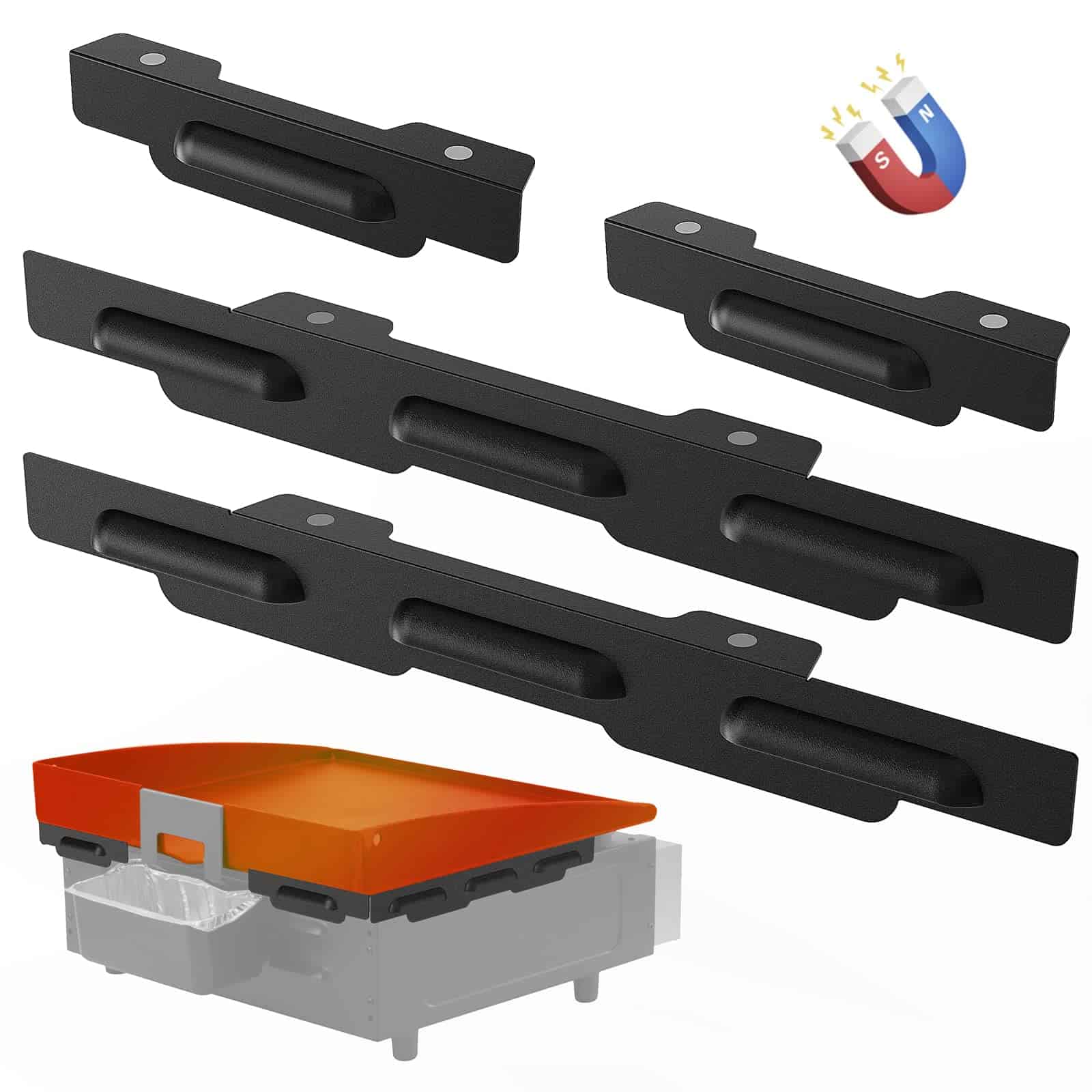 1. FÁCIL DE INSTALAR, QUITAR Y TRANSPORTAR Estos protectores de viento magnéticos se pueden instalar en la parrilla Blackstone en segundos colocando el lado magnético en la parte inferior de la parte superior de su parrilla Blackstone o en su cuerpo. Y estas pantallas de viento también son fáciles de quitar y transportar debido a su forma compacta y ligereza. 2. FÁCIL DE INSTALAR, QUITAR Y TRANSPORTAR Estos protectores de viento magnéticos se pueden instalar en la parrilla Blackstone en segundos colocando el lado magnético en la parte inferior de la parte superior de su parrilla Blackstone o en su cuerpo. Y estas pantallas de viento también son fáciles de quitar y transportar debido a su forma compacta y ligereza. 3. IMÁN Y ACERO INOXIDABLE DE ALTA CALIDAD La temperatura máxima de resistencia al calor del imán resistente a altas temperaturas puede alcanzar 660°F cuando se quema directamente por el fuego, lo que es duradero. El protector de viento está hecho de acero inoxidable 430, que es resistente a la corrosión, resistente a la oxidación y fácil de limpiar. El recubrimiento negro en la superficie combina perfectamente con su parrilla Blackstone. 4. COMPATIBILIDAD Compatible con la parrilla Blackstone de 17 pulgadas: 1650/1814/1832/1933/1939/1945/1971/1783/1859/1892 y otras parrillas de marca. Compatible con taza de grasa trasera, estante lateral, campana y cubierta. Protectores laterales (los más largos): 13.8» x 1.4», protectores traseros (los más cortos): 6.3» x 1.4». 5. COMBINACIÓN PERFECTA PARA SU PARRILLA Estos protectores de viento cubren los espacios entre la parte superior de la parrilla Blackstone y los quemadores, son compatibles con la taza de grasa trasera, estante lateral, campana y cubierta. Y puede dejarlos instalados en la parrilla Blackstone durante los viajes.