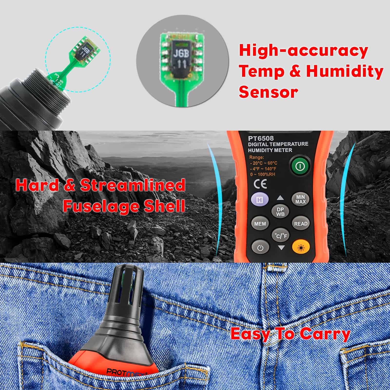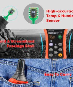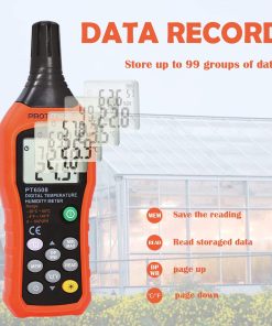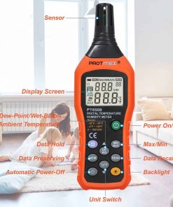 El Protmex MS6508 Medidor de Humedad & Temperatura Digital puede mostrar tres tipos de temperatura: temperatura ambiente, temperatura de punto de rocío y temperatura de bulbo húmedo. Tome rápidamente y de manera conveniente lecturas precisas de humedad y temperatura con el MS6508. El Protmex MS6508 es invaluable para técnicos de mantenimiento de instalaciones y servicios públicos, contratistas de servicios de HVAC y especialistas que acceden a la calidad del aire interior (IAQ). Características: Pantalla dual retroiluminada de humedad y temperatura. Mide las temperaturas de punto de rocío y bulbo húmedo. Capacidad de almacenamiento de registros de 99. Diseño ergonómico con funda protectora. Sensor capacitivo de respuesta rápida con tapa protectora de apertura giratoria. Compacto. Mantenimiento de datos máx./mín. Indicador de batería baja. La función de apagado automático se puede cancelar. Especificaciones: (1) Rango de temperatura ambiente: -20 a 60 ºC (-4 a 140 ºF). Precisión: 1.0 ºC (0 a 45 ºC) 1.5 ºC (-20 a 0 ºC, 45 a 60 ºC). Resolución: 0.1 ºC/ºF. Tasa de actualización: 400ms. (2) Rango de HR: 0 a 100%HR. Precisión: 3.0% HR (20% a 80%) 4.0% HR (0% a 20%, 80% a 100%). Resolución: 0.1%. (3) Temperatura de bulbo húmedo: -20 a 60 ºC (-4 a 140 ºF). Precisión: 1 ºC (0 a 45 ºC) 1.5 ºC (-20 a 0 ºC, 45 a 60 ºC). Resolución: 0.1 ºC/ºF. (4) Temperatura de punto de rocío: -50 a 60 ºC (-58 a 140 ºF). Precisión: 1 ºC (0 a 45 ºC) 1.5 ºC (-50 a 0 ºC, 45 a 60 ºC). Resolución: 0.1 ºC/ºF. Tasa de actualización: 400ms. Contenido del paquete: 1 x Protmex MS6508 Medidor de Humedad & Temperatura Digital. 1 x Manual del Usuario. 1 x Bolsa de medidor.