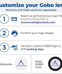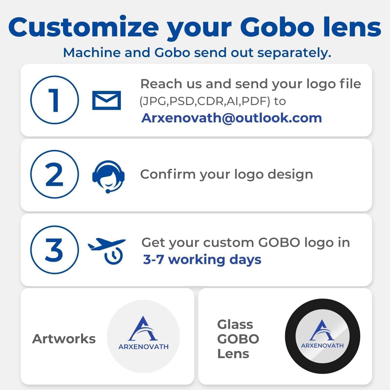 1. Distancia de Proyección: Proyector de logotipos Arxenovath, distancia máxima de proyección: de 3 a 32.8 pies. Diámetro máximo de proyección de logotipo: 140 pulgadas. Tamaño Gobo: Diámetro exterior 37.5mm x Diámetro interior 23mm.