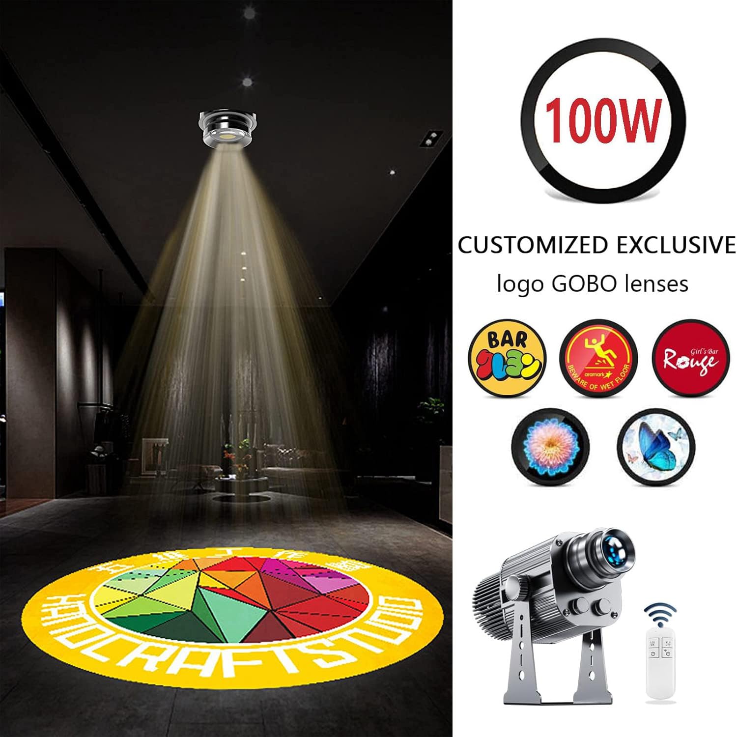 1. SUPER ALTA LUMINOSIDAD: Este proyector de logotipos está equipado con cuentas de lámpara LED de alta luminosidad de 100W, que pueden proporcionar haces de luz brillante para promocionar su marca, adecuado para publicidad comercial al aire libre, como discoteca, club, hotel, KTV, bar, pub, banquetes, Navidad, Halloween, bodas, reuniones familiares. 3. CONTROL REMOTO: Con control remoto para establecer la fijación/rotación del patrón y obtener un efecto de proyección encantador. Ya sea que el proyector esté instalado en el techo, en la pared o al aire libre, puedes controlar fácilmente la luz encendida/apagada. 4. LENTES DE GOBO DE CRISTAL: En comparación con los espejos de patrones de plástico y metal, las lentes de patrones de cristal pueden proyectar fácilmente patrones de logotipos complejos. Tiene una alta resistencia al calor y transparencia. 5. INSTALACIÓN FÁCIL: El diseño especial del soporte protege su proyector de señalización y facilita su reemplazo. La instalación lleva menos de 5 minutos y no requiere un técnico. Se puede montar en paredes, pisos y techos para proyectar una imagen nítida para su evento especial.