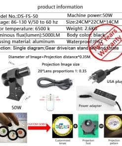 Fuente de Luz: LED de 50W 6500K (blanco), expectativa de vida de 50,000 horas Imagen: Estacionaria/rotativa ajustable Lumen: 5000LM Voltaje de Entrada: Fuente de alimentación 85 a 120VAC, 50/60 Hz Tamaño del Gobo: 37.5mm exterior, 26mm imagen Ángulo del Haz: 15 Rango de Proyección: Brillante 34 pies, Oscuro 56 pies, Sombra 76 pies Carcasa: Aleación de aluminio