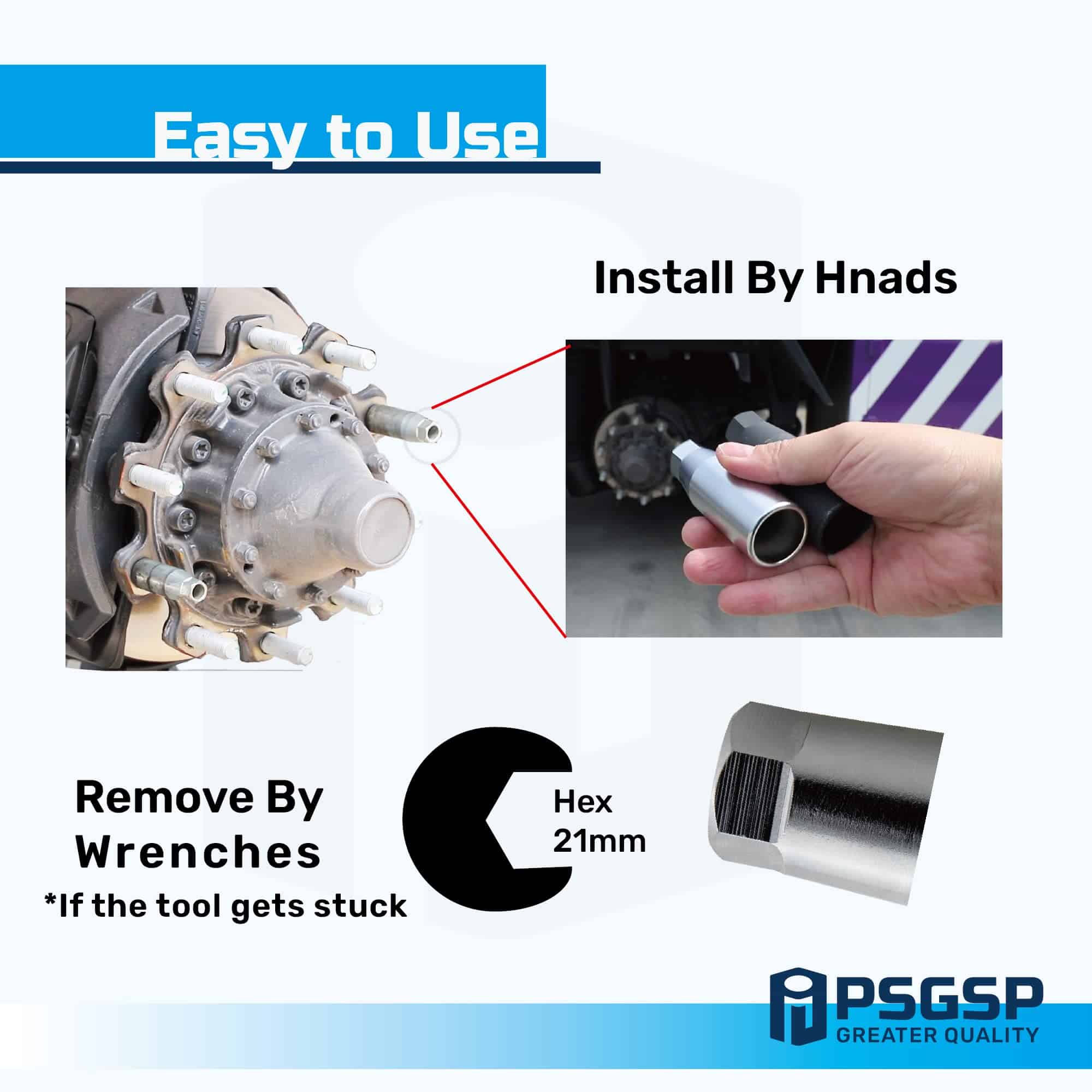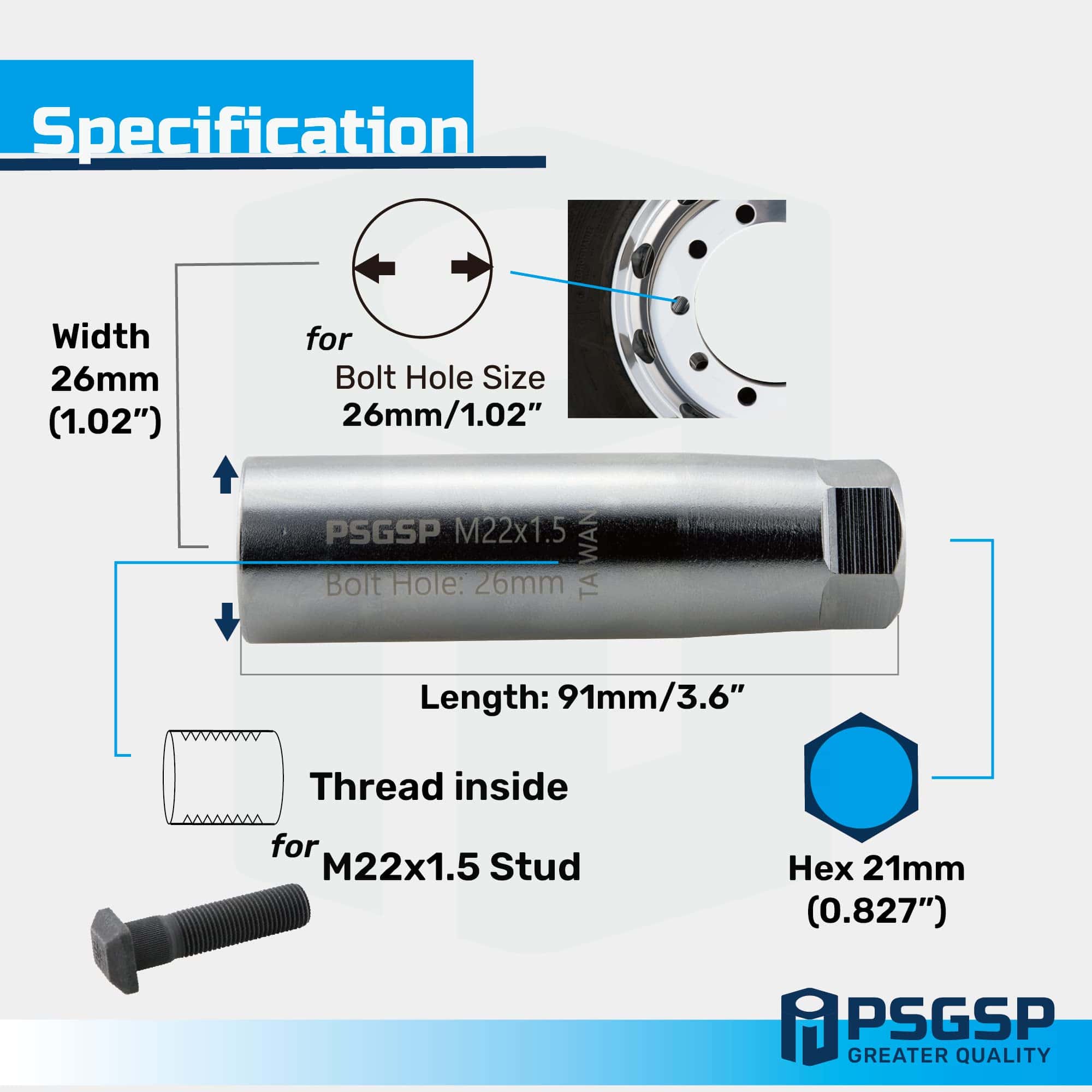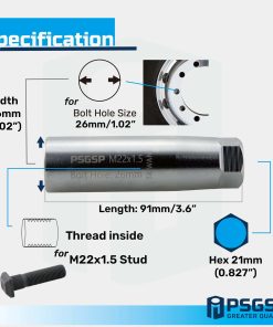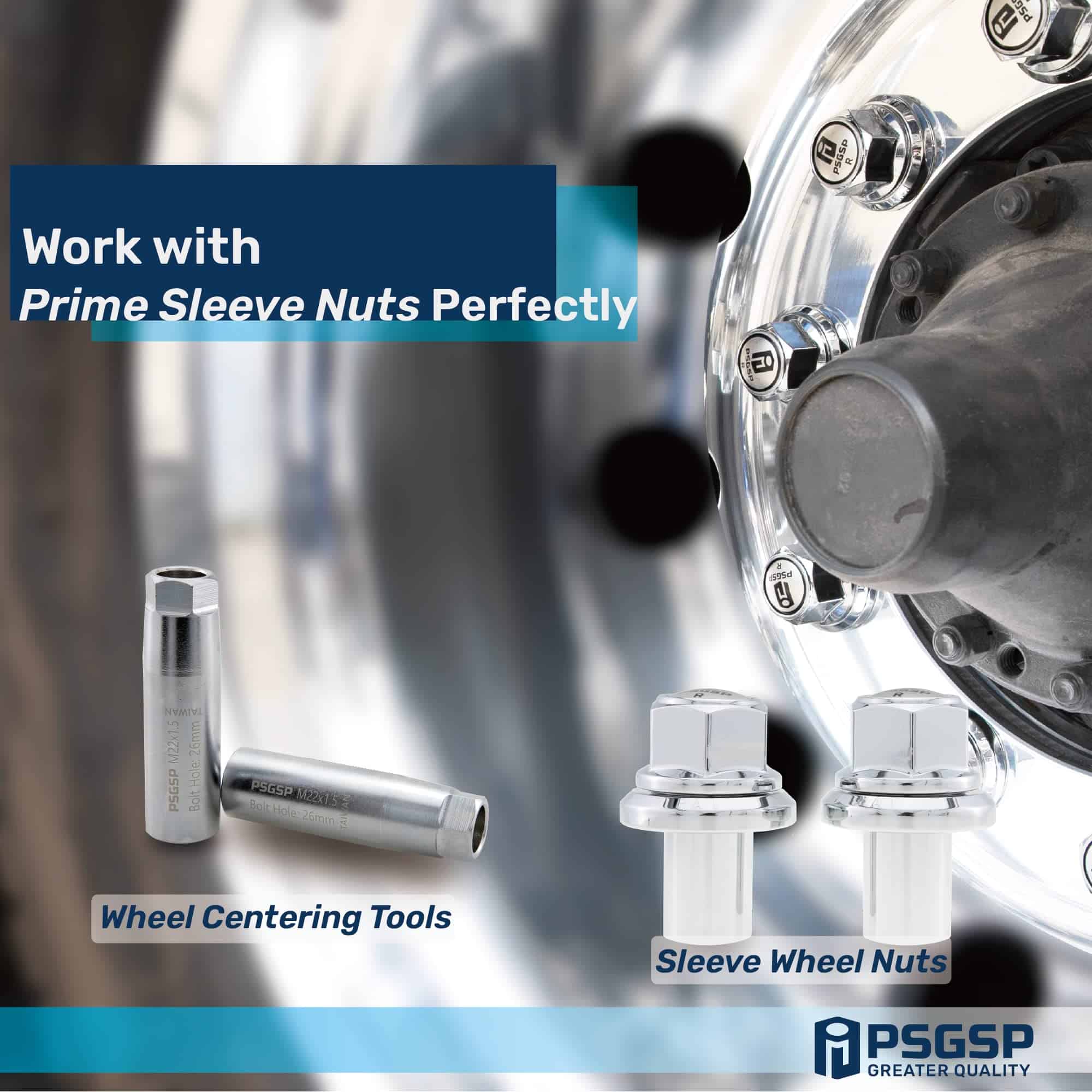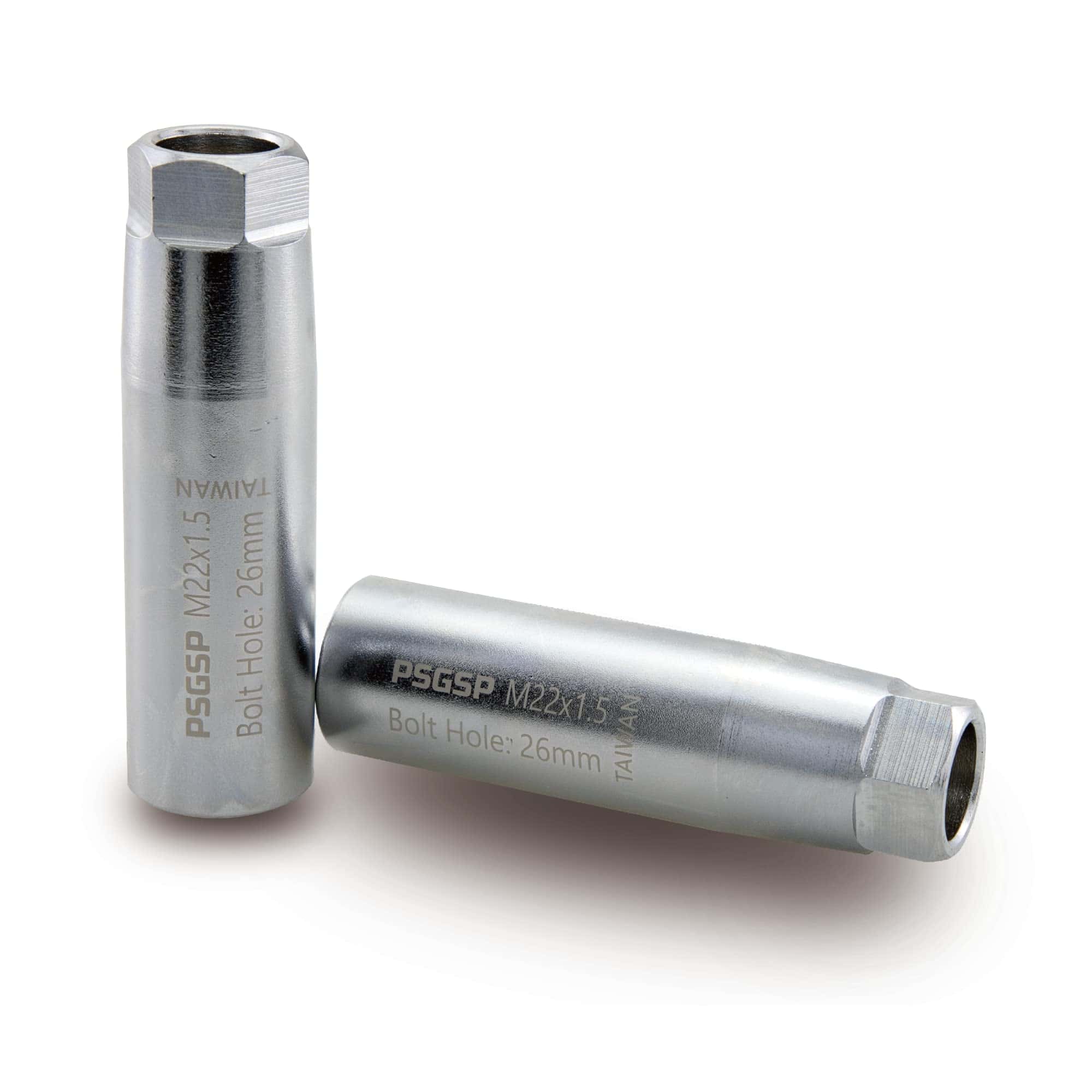 PSGSP Wheel Centering Tool Pair Frosted Chrome con Rosca Interna M22x1.5 para Ruedas de Camión de Servicio Pesado con Orificio de Perno de 26 mm (1.02 pulgadas) es una herramienta diseñada para facilitar la instalación de ruedas en camiones de servicio pesado. Con un diseño simplificado, esta herramienta cuenta con una rosca en el interior de la manga y un hexágono en la parte superior que permite una instalación y extracción más fácil con la mano o con una llave hexagonal M21. La herramienta ayuda a centrar la rueda en el cubo de la rueda, simplificando el proceso de instalación. Además, está marcada con múltiples colores y grabada con ESPEC para una fácil identificación. Fabricada con acero al carbono de alta resistencia, esta herramienta es confiable y ofrece una calidad superior.