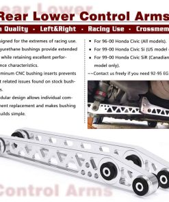 Aplicación: Para 96-00 Honda Civic (Todos los modelos). Para 99-00 Honda Civic Si (Solo modelo estadounidense). Para 99-00 Honda Civic SiR (Solo modelo canadiense). ¡También ofrecemos LCA y refuerzo de subchasis para eg(92-95) ek(96-00)! Diseñado para los extremos del uso en carreras. Especificación: Los bujes de poliuretano de alta calidad hechos a medida (fabricados según nuestras especificaciones por Energy Suspension) proporcionan una vida útil prolongada manteniendo excelentes características de rendimiento. Los insertos de buje de aluminio CNC evitan problemas relacionados con el óxido encontrados en los bujes originales. El diseño modular permite la sustitución de componentes individuales y hace que la reconstrucción de bujes sea sencilla. Los bujes de tipo trampa no requieren tornillos de ajuste que causen puntos de estrés innecesarios. Juntas de buje de ancho completo para máxima resistencia y fiabilidad en las condiciones más extremas. Se proporcionan tres agujeros de montaje de barra para la instalación fácil de la mayoría de las barras estabilizadoras de fábrica y de mercado secundario, y permite ajustar la rigidez de la barra estabilizadora fácilmente. Paquete Incluido: 1x Par de LCA con Kit. En PTNHZ, si tiene alguna pregunta sobre nuestro producto, contáctenos de inmediato, podemos manejar cualquier problema.