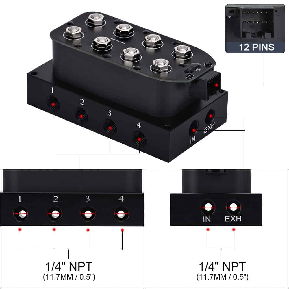 1/4 NPT para todos los 10 puertos y 2 esquinas de 1/8 NPT.