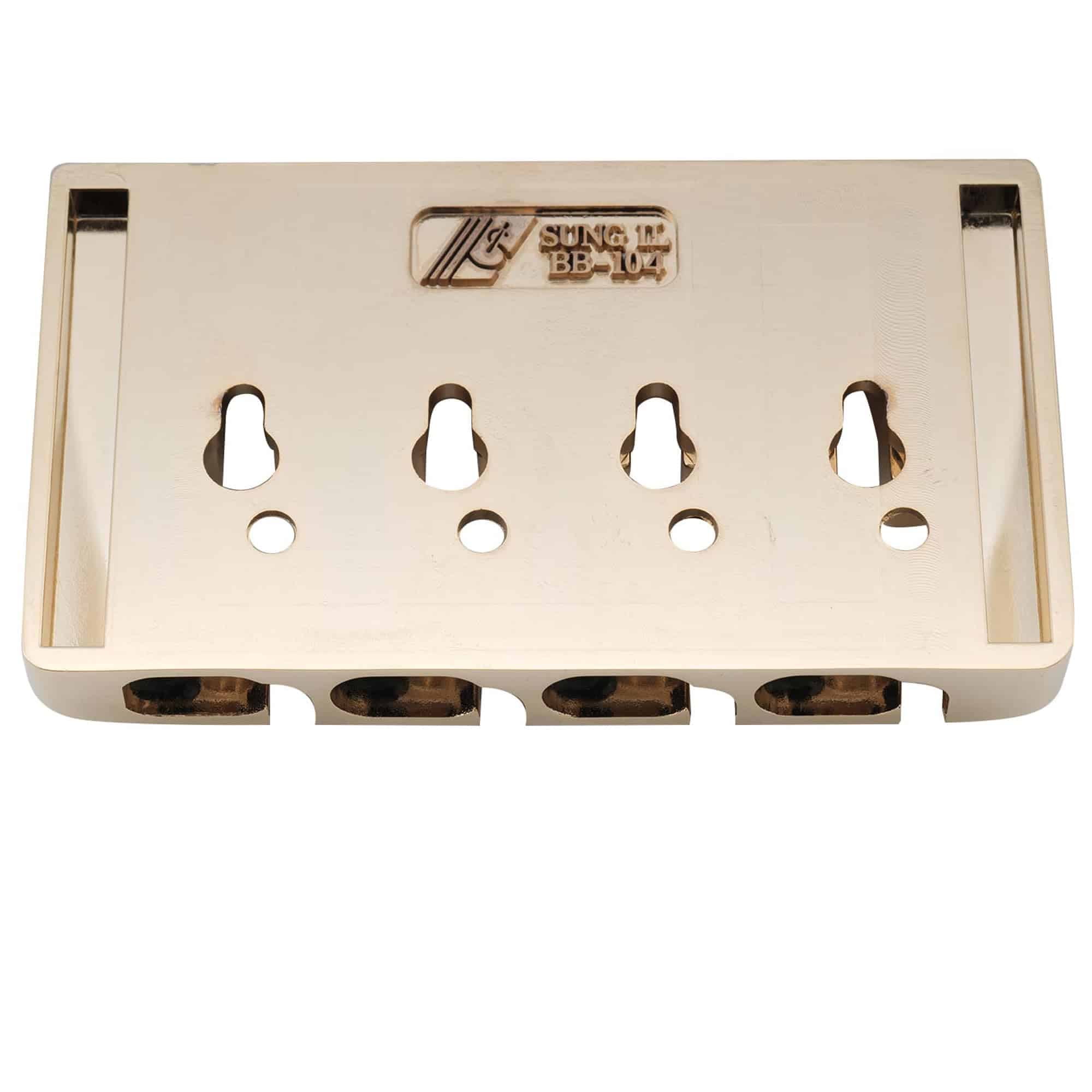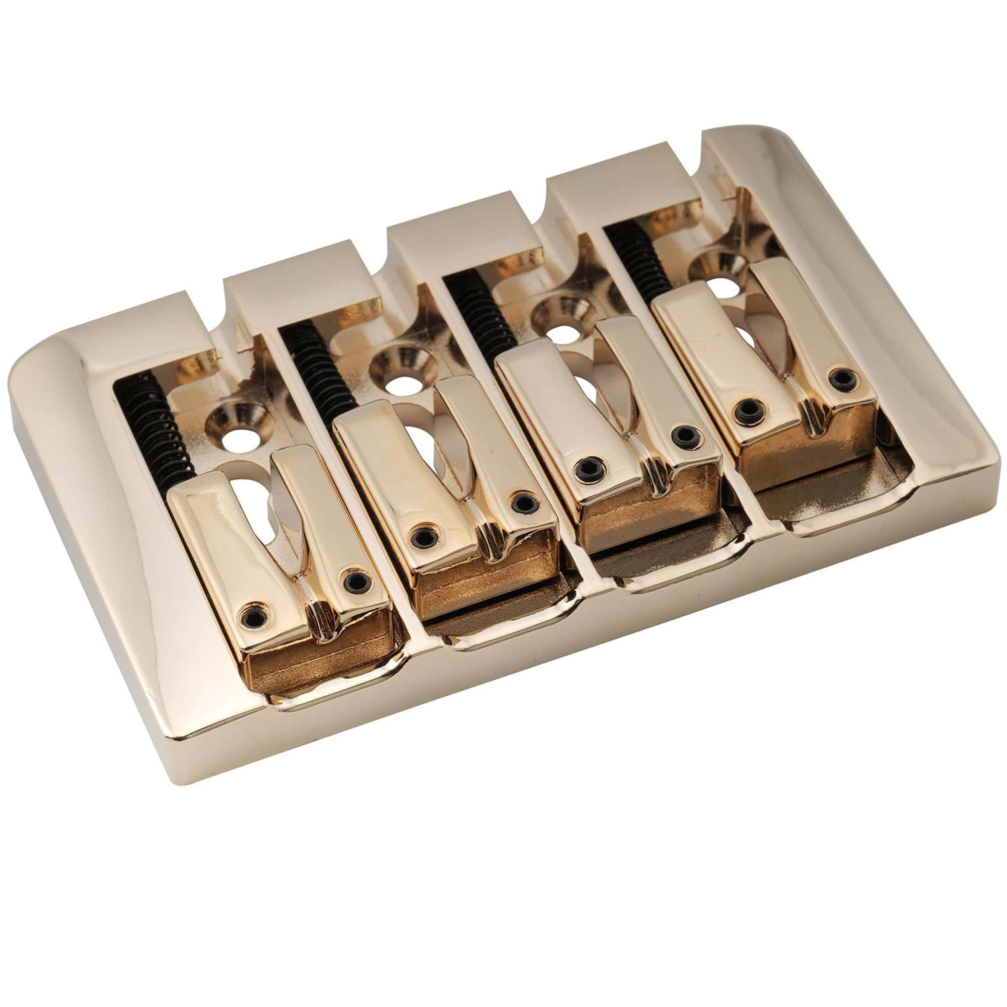 Puente de bajo de 4 cuerdas de zinc duro pre-radiado Musiclily Pro, dorado. Este puente se ajusta a algunos bajos eléctricos de 4 cuerdas y permite la combinación de carga superior y cuerdas a través del cuerpo. Con un espaciado total de cuerdas de 19mm x 3 57mm (2-1/4 pulgadas) y 4 orificios de tornillo de montaje con espaciado de 19mm x 3 57mm (2-1/4 pulgadas), este puente está hecho de aleación de zinc de alta densidad, que es duradera y estable. La placa de base pre-radiada permite un ajuste más preciso y una mejor entonación. El paquete incluye 1 juego completo de puente y accesorios de montaje para una fácil instalación.