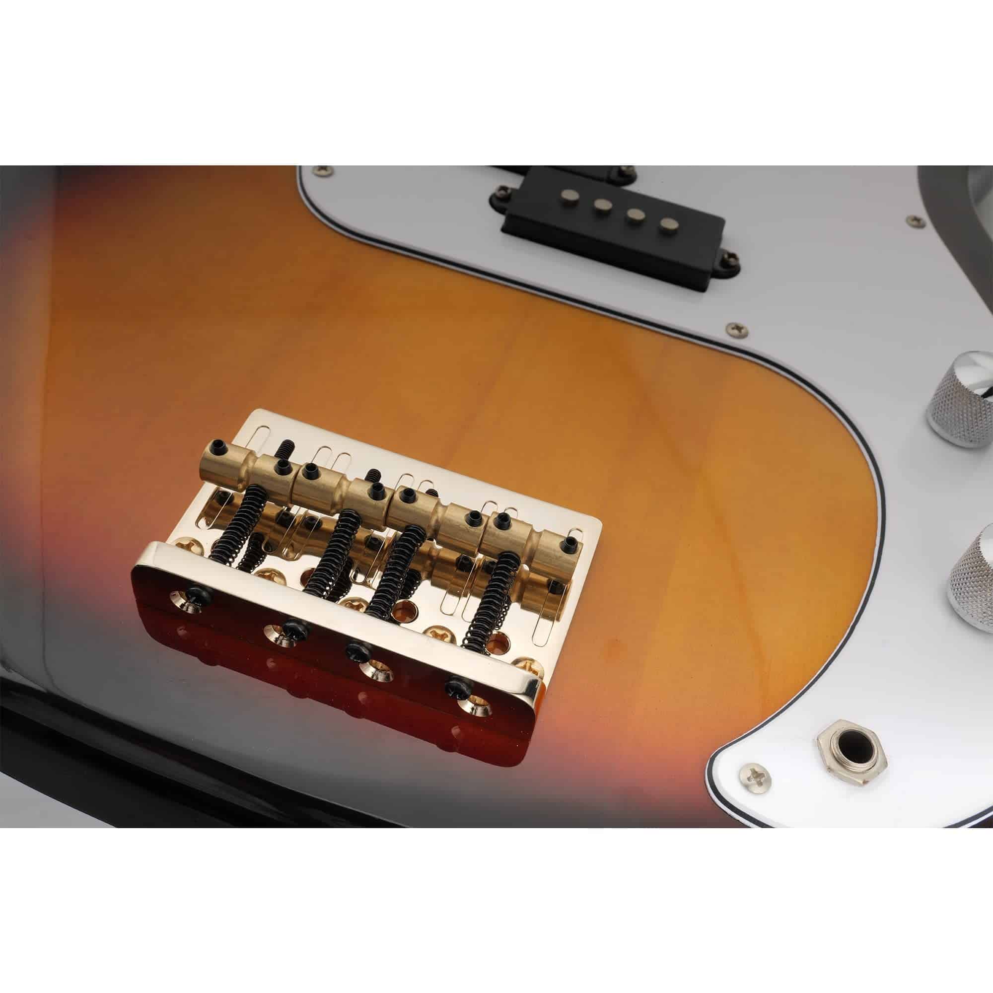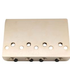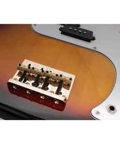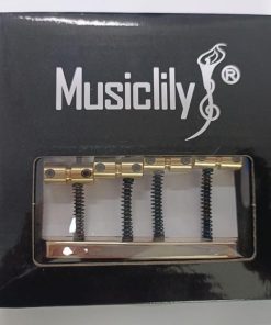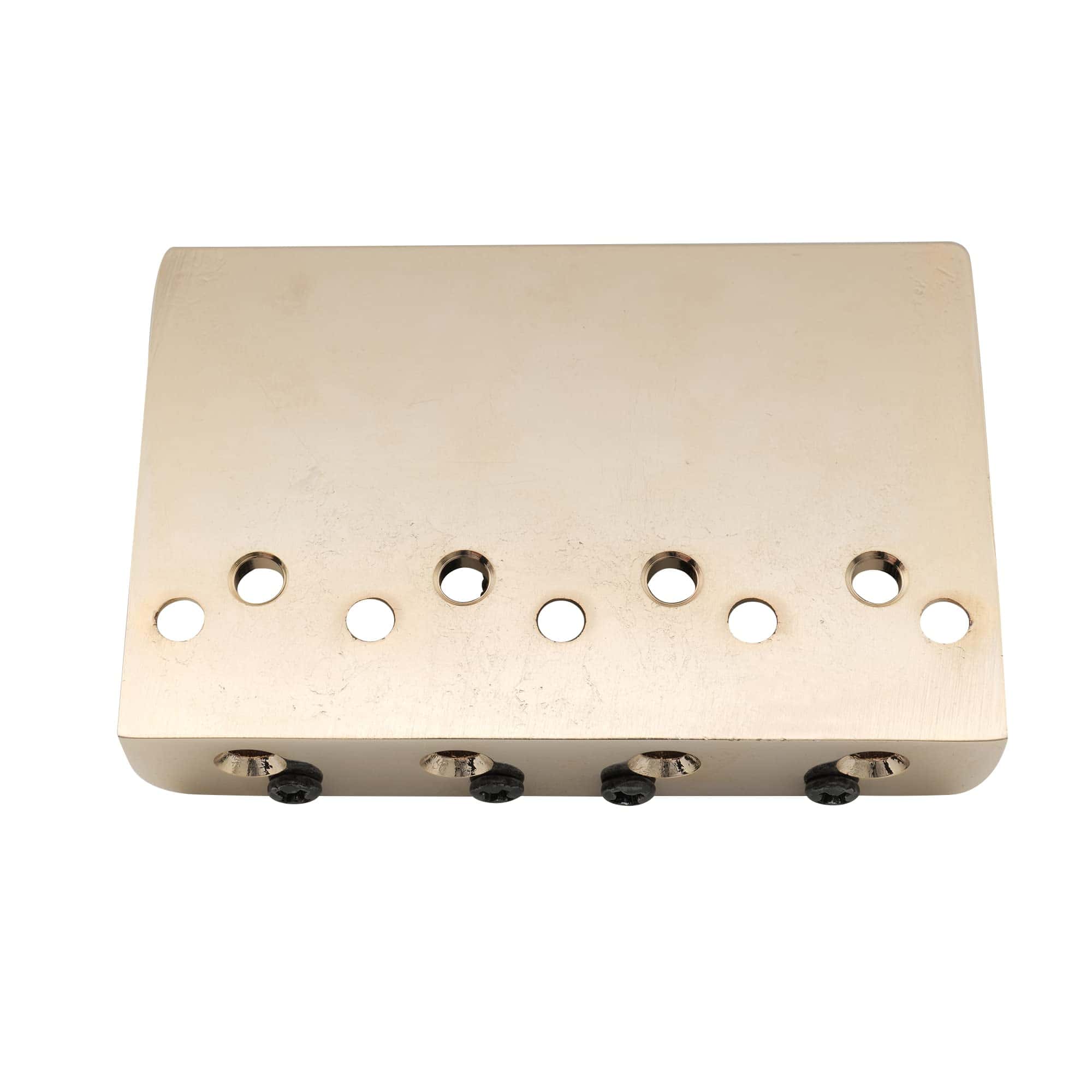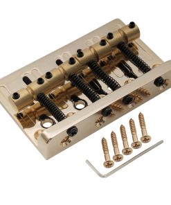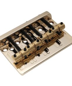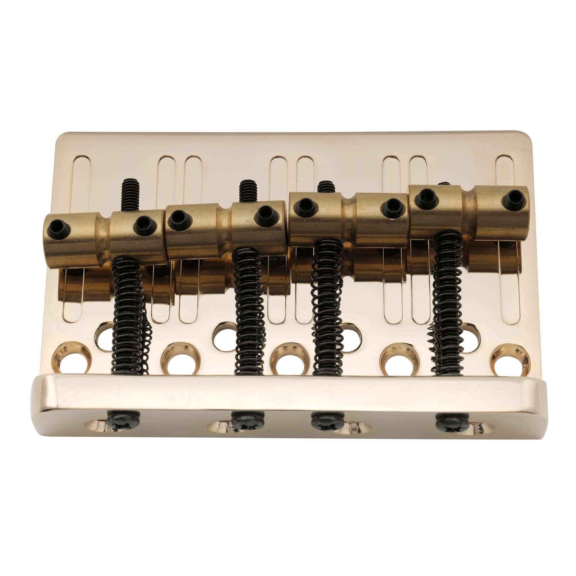 Puente de bajo de 4 cuerdas de 19mm de Musiclily Pro con selletas de latón y placa de acero en color dorado. Este puente es compatible con bajos eléctricos de 4 cuerdas como Squier Precision bass, Jazz bass y otros estilos similares. El espaciado total de cuerdas es de 19x3mm 57mm (2-1/4 pulgadas), con una separación de 5 agujeros de tornillo de montaje de 17.5x4mm 70mm (2-3/4 pulgadas). Las auténticas selletas de latón de estilo barril montadas en la placa base de acero crean el puente de bajo vintage perfecto como el original, siendo duradero y estable, convirtiéndolo en una buena elección para actualizar tu viejo puente de bajo. Puede ser utilizado tanto para carga superior como para cuerda a través del cuerpo. El paquete incluye 1 set de puente y accesorios de montaje para una fácil instalación.