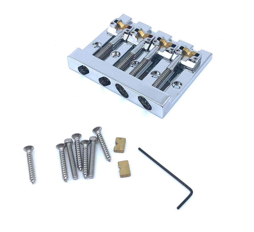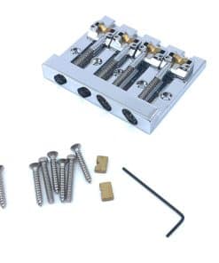 Dedicado con cariño al abuelo de los puentes de alta masa, Hipshot se enorgullece de ofrecer el Puente de Bajo KickAss. Pasaron años más incontables versiones asegurándose de que este ‘tributo’ poseería el alma del original sin ser una copia. El KickAss cuenta con el siguiente diseño único: inserciones pre-cortadas en la selleta (no se necesita limar). Estas inserciones le permiten ajustar fácilmente el espaciado de sus cuerdas desde un estrecho .687″ (17.5mm) hasta un ancho de .800″ (20mm) y en cualquier punto intermedio. Viene de serie con insertos de latón en la selleta que enfatizan el tono fundamental y le dan a su bajo un sonido suave. También se incluyen dos inserciones adicionales para una mayor gama de ajuste de altura. El KickAss se monta en una configuración típica de 5 orificios para bajo y cuenta con agujeros de bolas de cuerda empotrados para un aspecto más elegante. Todos los herrajes de montaje incluidos.