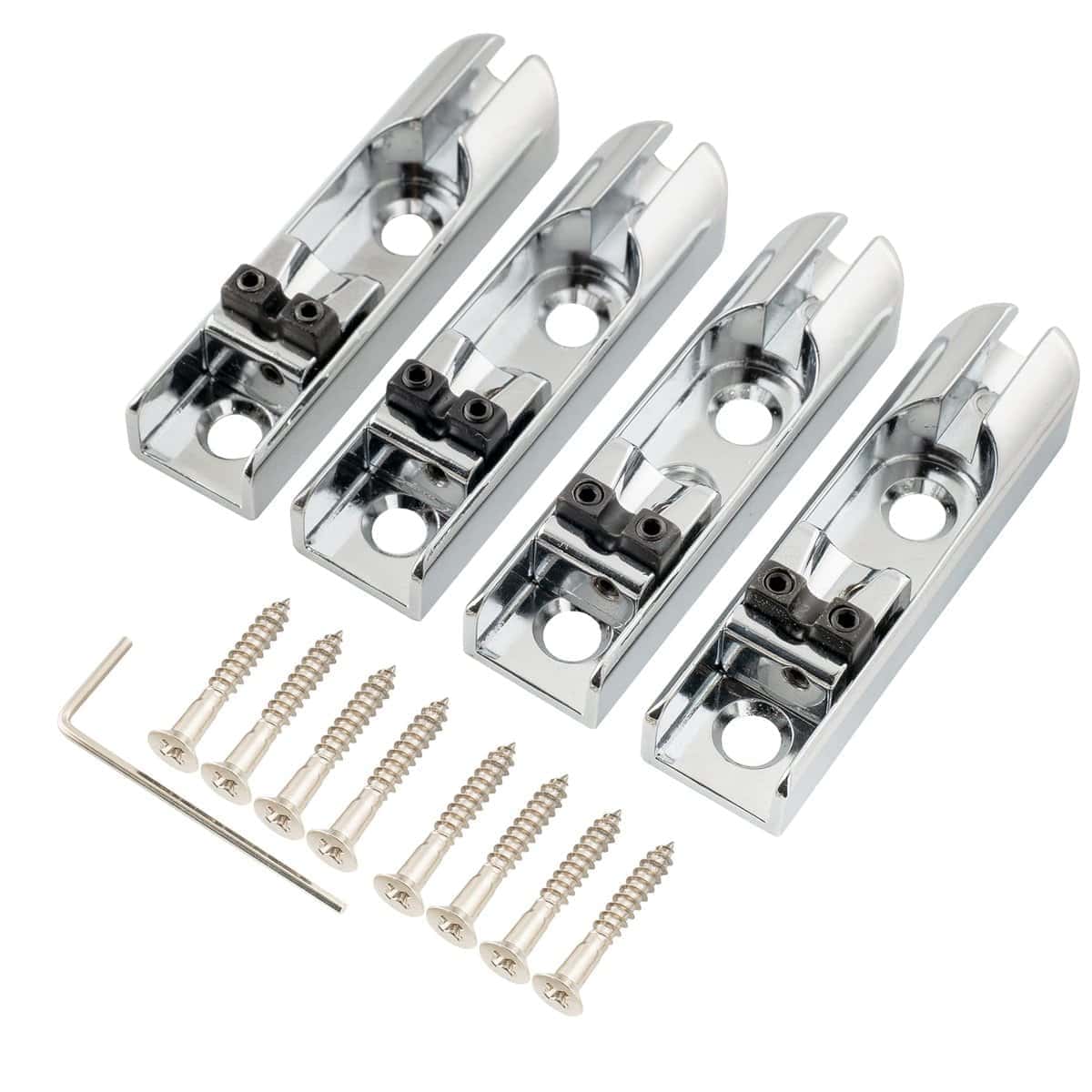 Puente de Bajo Individual Musiclily Pro Single String Lock-Down para Bajo Eléctrico de 4 Cuerdas, Cromo (Set de 4). Este puente de bajo individual te permite personalizar la configuración de tus cuerdas para adaptarse a tus necesidades específicas. Con una longitud de 61mm y un ancho de 15.5mm, este puente está diseñado para adaptarse a una variedad de bajos de 4 cuerdas. Hecho de acero con una selleta de aleación de zinc, este puente ofrece durabilidad y versatilidad. Ya sea que prefieras la carga superior o a través del cuerpo, este puente te brinda la flexibilidad para crear tu propio sonido único. Incluye 4 puentes individuales y accesorios de montaje para una fácil instalación.
