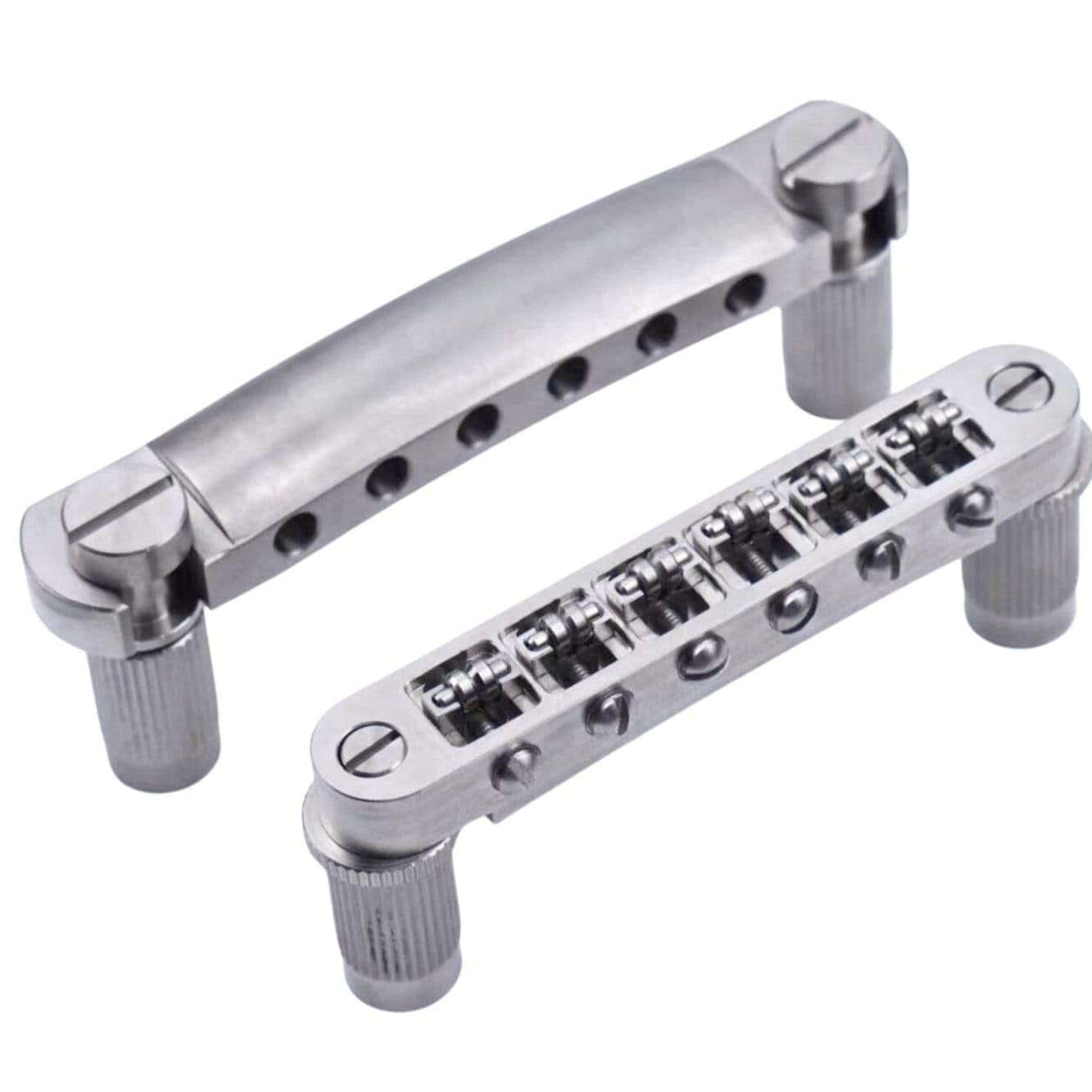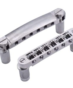 Puente de reemplazo/mejora con clavijas para instrumentos de 6 cuerdas con Tune-o-Matic. Fácil de instalar y conveniente de usar. Hecho de material de aleación de titanio, duradero y resistente. Silletas de aleación de titanio de baja fricción permiten que las cuerdas se muevan libremente y vuelvan al tono exacto. COLOR PLATA