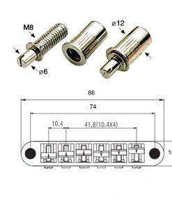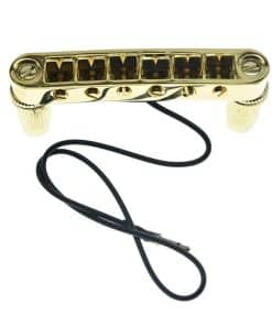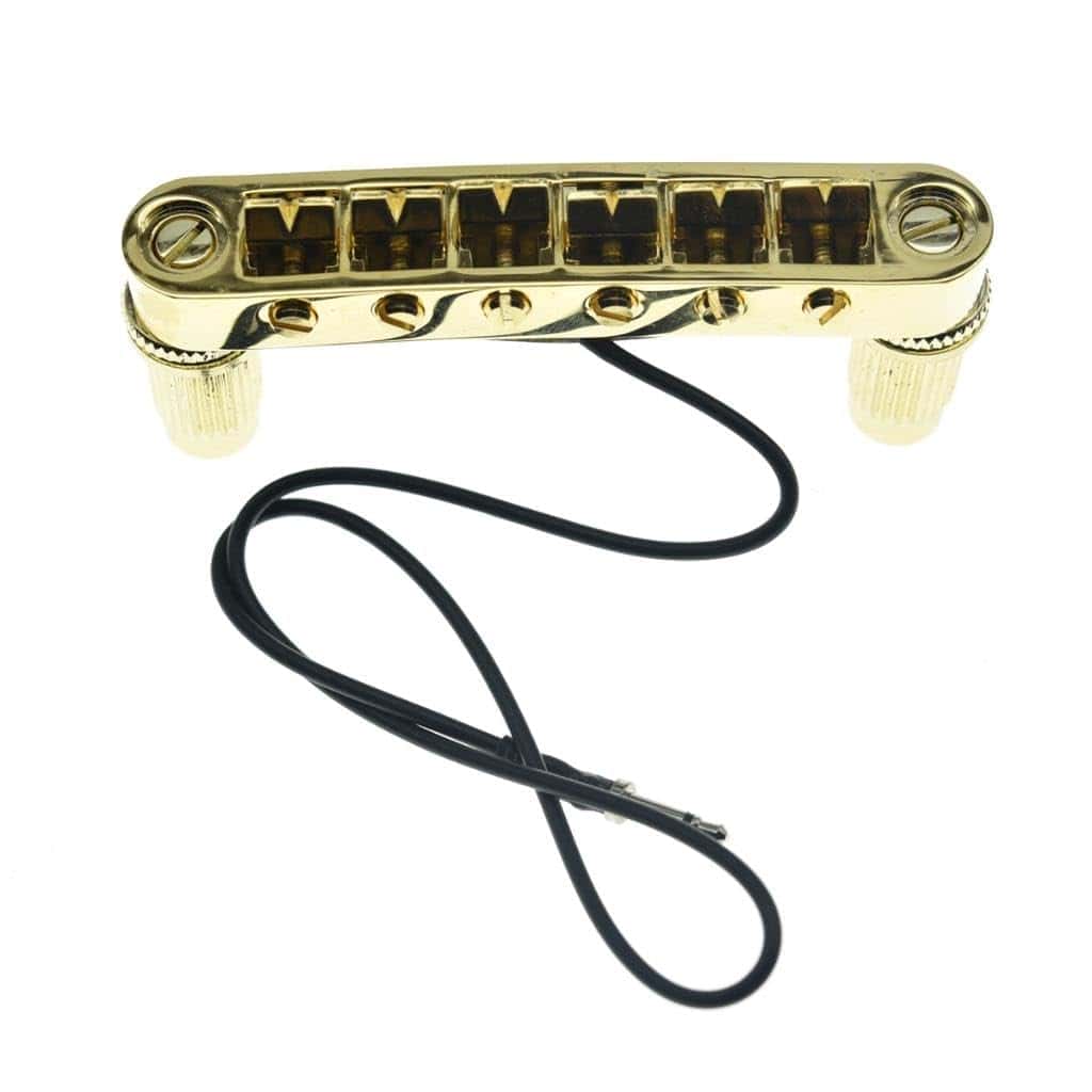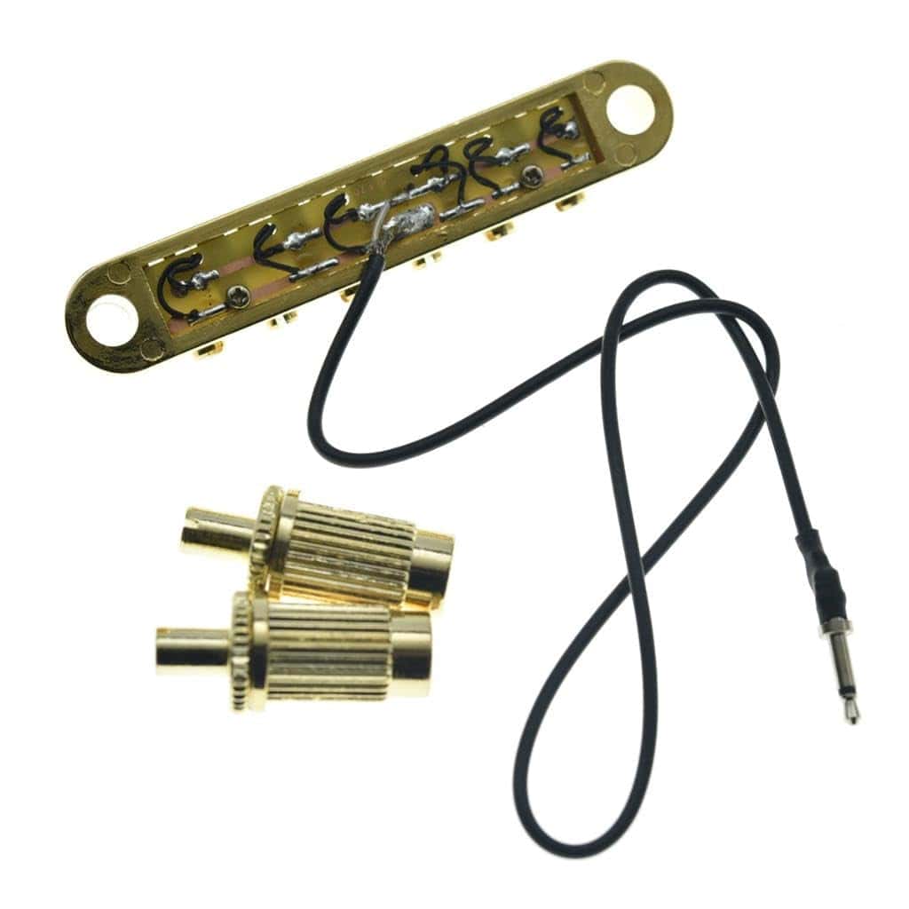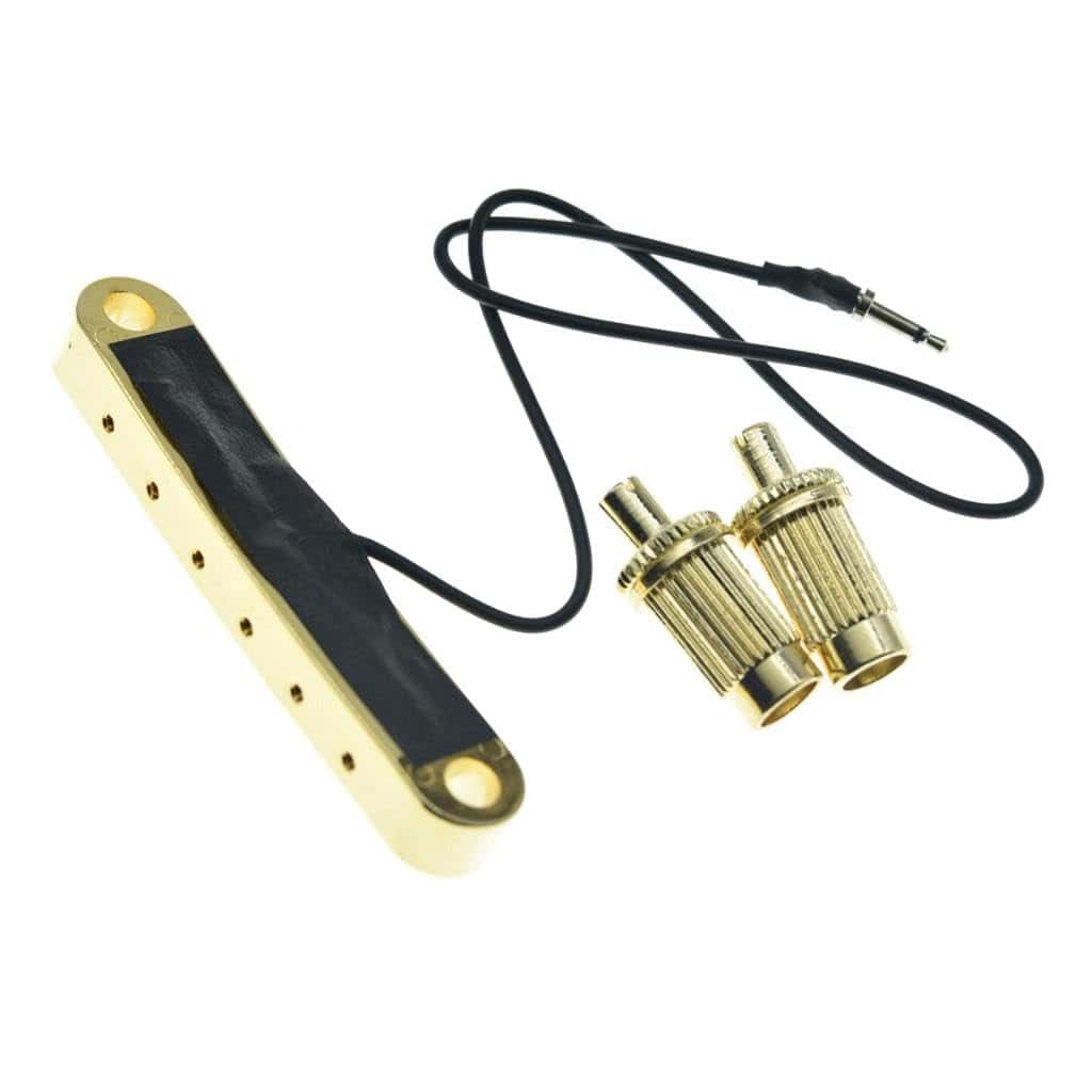 Puente KAISH LP Tune-o-Matic con pastilla piezo LP para guitarra Epi Les Paul/SG/ES/Dot en color dorado. El puente tiene un radio de 12″ e incluye un pequeño piezo en cada selleta para captar el movimiento físico de la selleta al tocar la cuerda. La salida del pequeño piezo debe ser alimentada a un preamplificador para balancearla con las pastillas magnéticas estándar de una guitarra eléctrica. Cada selleta contiene una mini pastilla de alta salida que se combinan para producir hermosos tonos acústicos cálidos. Este puente está fabricado con alta calidad e incluye anillos de retención de selleta para eliminar el traqueteo, un jack de extremo de 3mm que se puede quitar si no lo conectas a un preamplificador, selletas móviles para entonar cada cuerda individualmente y cabezas de tornillo en la parte superior de los postes para un fácil ajuste de altura. Los agujeros para los postes miden 74mm en el centro; Ancho total de 86mm; Espaciado de cuerda de 10.4mm (52mm en total); Diámetro de montaje de poste de 6mm; Diámetro exterior de los postes: 12mm; Estos puentes están hechos según especificaciones de importación y se ajustarán perfectamente en guitarras Epiphone Les Paul/SG/ES/DOT/Flying V y similares.