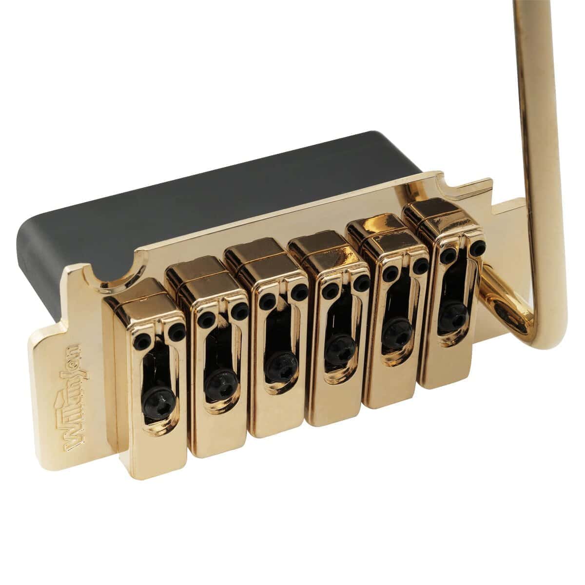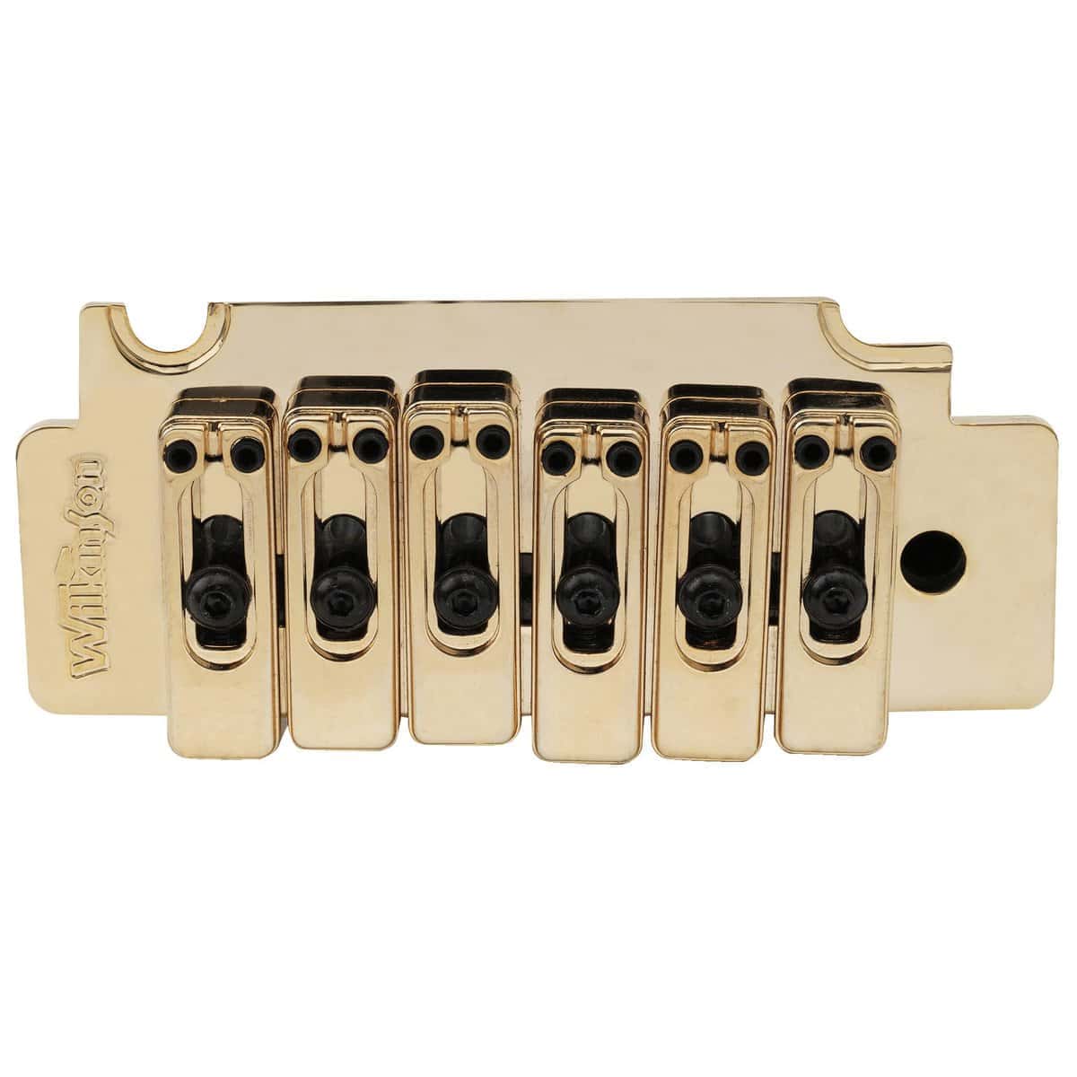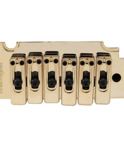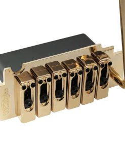 Puente de trémolo de 2 puntos Wilkinson WVS50K de 54 mm con selleta bloqueable para guitarra eléctrica estilo Squier Strat, dorado. Incluye juego completo de ensamblaje de puente y accesorios de montaje. Espaciado de cuerdas: 54 mm (2-1/8″), espaciado del perno de pivote: 63 mm (2-31/64″), diámetro exterior del perno: 10 mm (25/64″). Selletas de aleación de zinc con característica de «bloqueo»; bloque completo de aleación de zinc de 40 mm de profundidad, pesado y grueso, más sustain, SOLO se ajusta a cuerpos de guitarra con un espesor superior a 45 mm (1-49/64″); Brazo de trémolo de inserción.