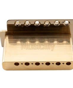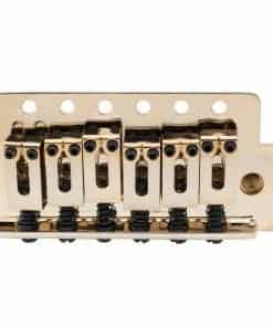 Puente de trémolo de 6 tornillos moderno de 52.5mm Musiclily Pro para guitarra eléctrica estilo Squier Strat, bloque sólido de latón de 40mm, oro. Se adapta a guitarra eléctrica estilo Squier Strat, diseño de 6 tornillos, por favor verifica el tamaño de tu guitarra antes de comprar. Espaciado de cuerdas: 52.5mm (2-1/16 pulgadas), espaciado de agujeros de tornillo de montaje: 52.5mm (2-1/16 pulgadas). Selletas de aleación de zinc estilo moderno, placa de acero, bloque sólido de latón de 40mm que aporta mejor sostenimiento, brazo de trémolo de acero enroscado de 5.8mm. Construcción de fundición de metal completo, bien acabado, buena opción para mejorar tu guitarra. Paquete incluido: 1 juego completo de puente de trémolo y accesorios de montaje.