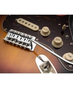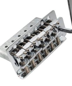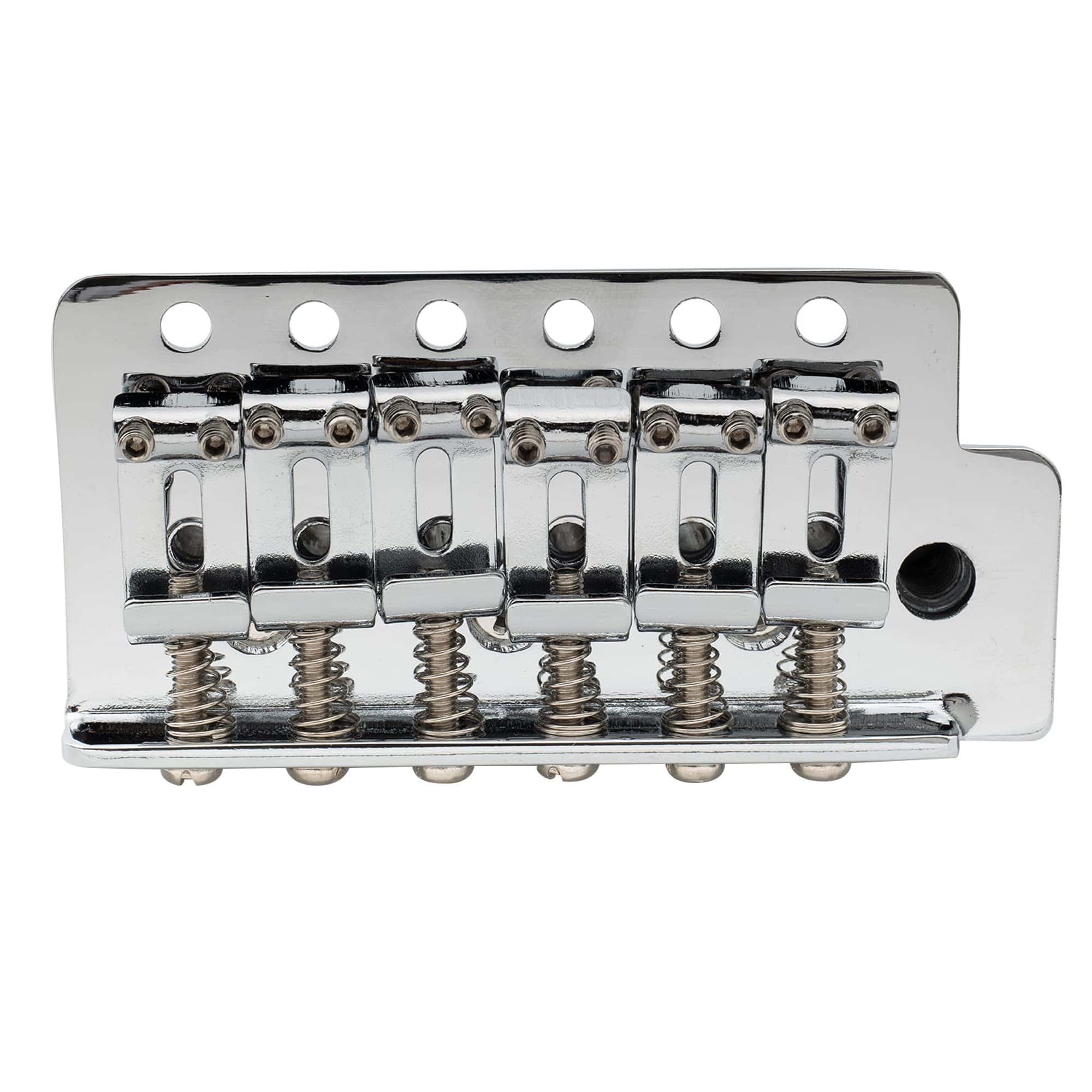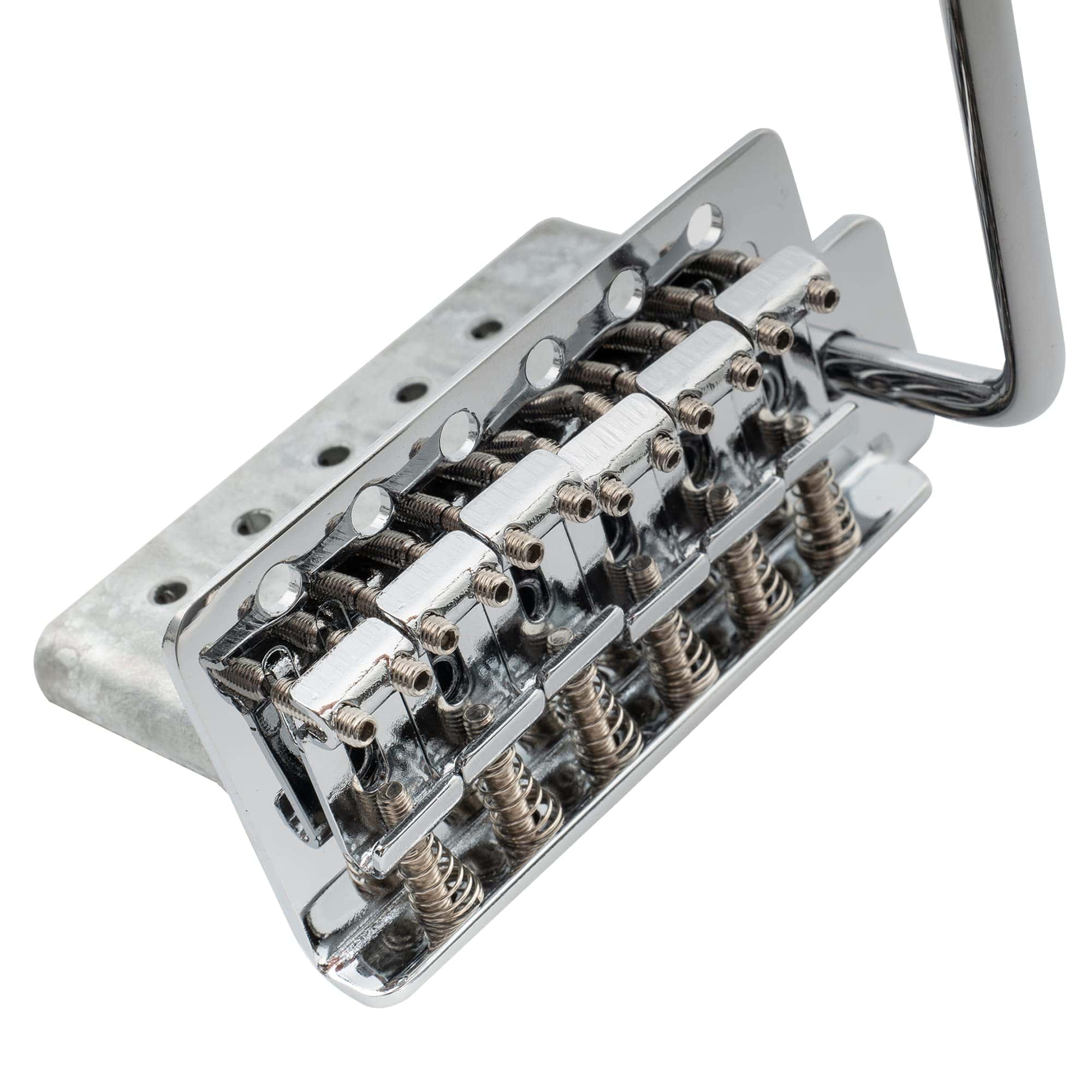 Puente de trémolo de alta calidad de 52,5 mm de espaciado entre cuerdas para guitarras eléctricas con estilo Strat Squier. Diseño vintage de 6 tornillos con selletas de acero dobladas, placa de acero resistente, bloque de aleación de zinc de 36 mm de altura y brazo de trémolo de acero enroscado de 5,8 mm. La construcción de fundición de metal completo asegura durabilidad y resistencia. Perfecto para mejorar el rendimiento de tu guitarra. Verifica la compatibilidad con el tamaño de tu guitarra antes de comprar.