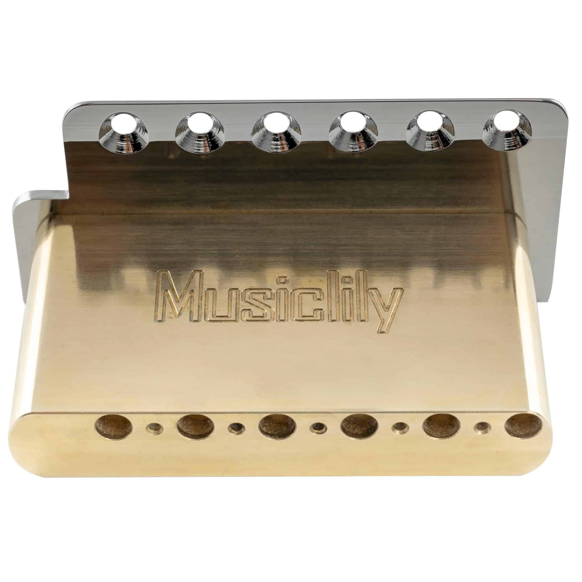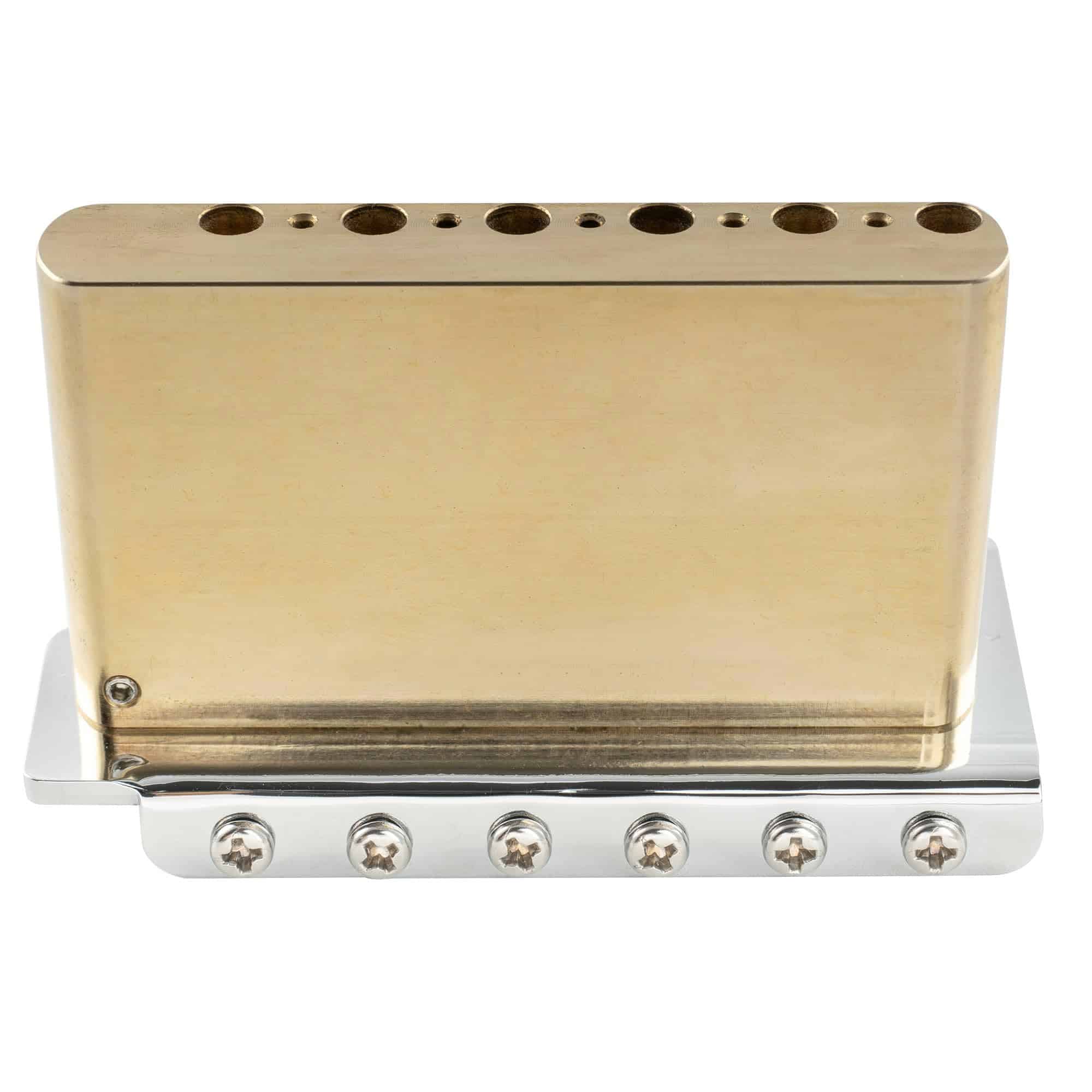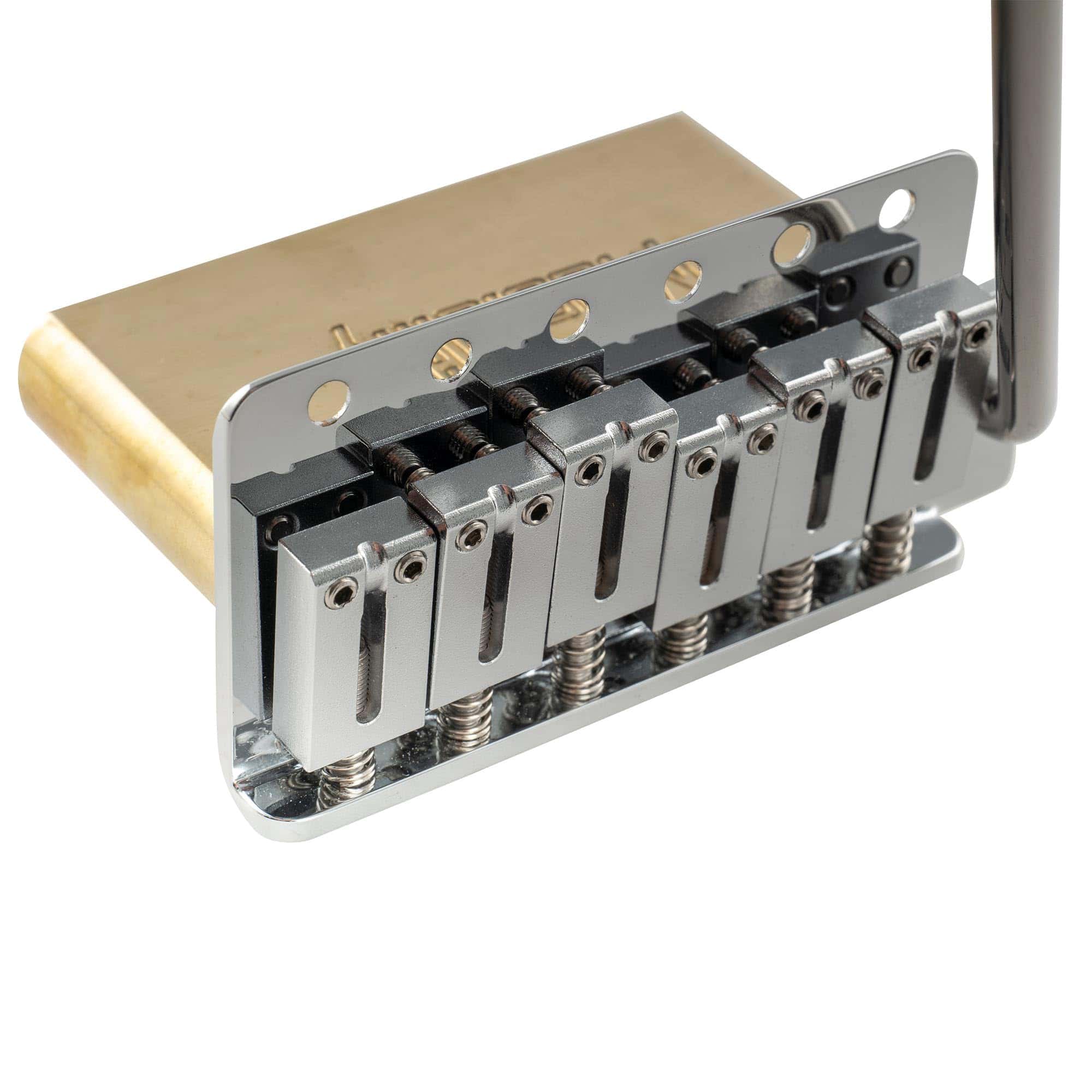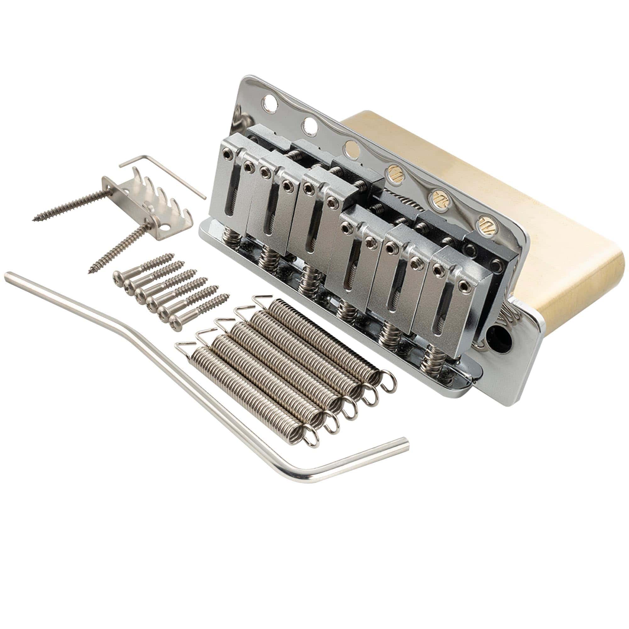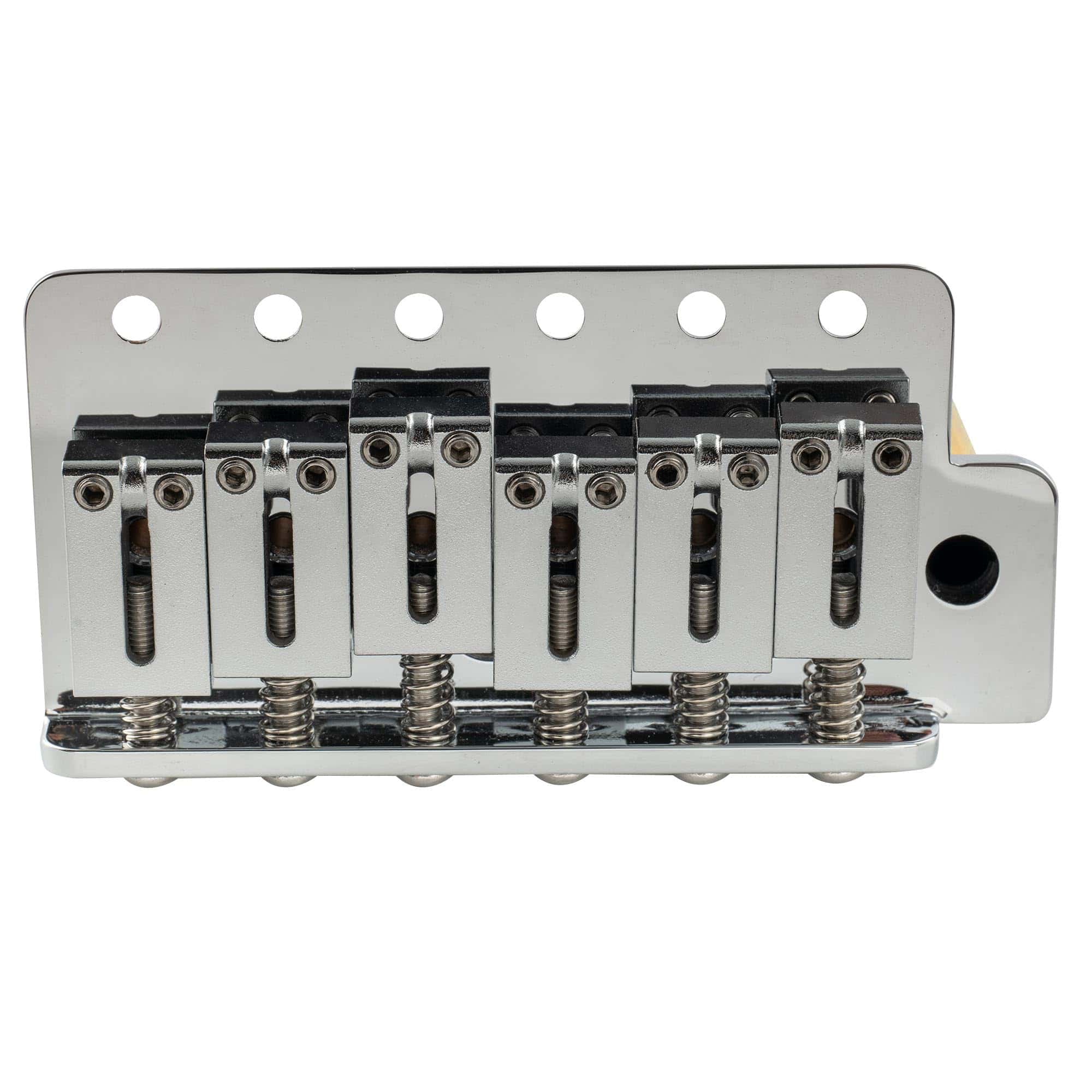 Puente de trémolo estilo vintage americano de 56mm (2-7/32 pulgadas) Musiclily con 6 tornillos para guitarra eléctrica estilo Strat, Chrome. Se adapta a guitarras eléctricas estilo Fender y Squier Strat con sistema de puente de trémolo, modelo de montaje de 6 tornillos. Cuatro selletas modernas de latón macizo, placa de acero inoxidable, brazo de trémolo de inserción de acero inoxidable de 5 mm, bloque completo de latón macizo de 42 mm de profundidad, SOLO se adapta a cuerpos de guitarra con un grosor superior a 45 mm (1-49/64 pulgadas), lo que proporciona un mejor sustain. Técnica de procesamiento CNC digital precisa mecanizada, estable y duradera, bien acabada, buena opción para mejorar tu guitarra. El paquete incluye: set de montaje completo del puente de trémolo y accesorios de montaje.