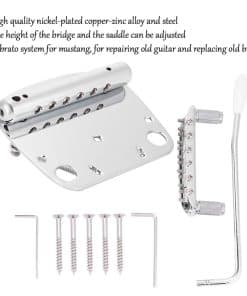 Características: 1. Material: Hecho de aleación de cobre-cinc plateado de alta calidad y acero, resistente y duradero para que lo uses. 2. Característica: Viene con llaves, la altura del puente y la selleta se pueden ajustar, resorte de alta calidad y brazo, puede proporcionar un vibrato maravilloso. 3. Bonito: La cola está plateada uniformemente con níquel y la superficie se ve hermosa. 4. Aplicación: Sistema de vibrato para mustang, para reparar guitarras antiguas y reemplazar puentes viejos. 5. ¡Clientes felices! – ¡Dilwe continúa brindando la mejor experiencia de usuario con tecnología innovadora de una marca confiable. Por favor, siéntete libre de contactarnos si tienes alguna solicitud, ¡resolveremos tu problema en 24 horas! Especificaciones: Condición: 100% nuevo Material: Aleación de cobre-cinc plateado de níquel + acero Peso: Aprox. 429g / 15.1 oz Espaciado de la selleta: Aprox. 1.1 cm / 0.4 pulgadas Tamaño de la cola: Aprox. 10.2 8.7 4.8cm / 4.0 3.4 1.9 pulgadas Tamaño del puente: Aprox. 8.8 2 3.5cm / 3.5 0.8 1.4 pulgadas Lista de paquetes: 1 cola 1 puente 1 brazo de trémolo 2 llaves 5 tornillos