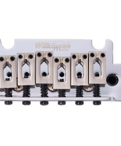 Puente de trémolo para guitarra eléctrica Wilkinson WOV06 de 2-1/8 pulgadas 2 puntos para Strat moderna. Este puente de trémolo cromado es ideal para guitarras eléctricas tipo ST. Cuenta con 6 selletas de aluminio para un ajuste preciso de las cuerdas. Compatible con la mayoría de las guitarras ST MIJ y MIK de los años 80. La placa base de acero cromado y el sistema de montaje de 2 postes aseguran una estabilidad óptima durante el uso. Las selletas sólidas proporcionan un sonido de rango medio ideal para pastillas simples o humbuckers. Fabricado con materiales de alta calidad para una durabilidad excepcional. Perfecto para músicos exigentes que buscan un puente de trémolo fiable y de alto rendimiento.