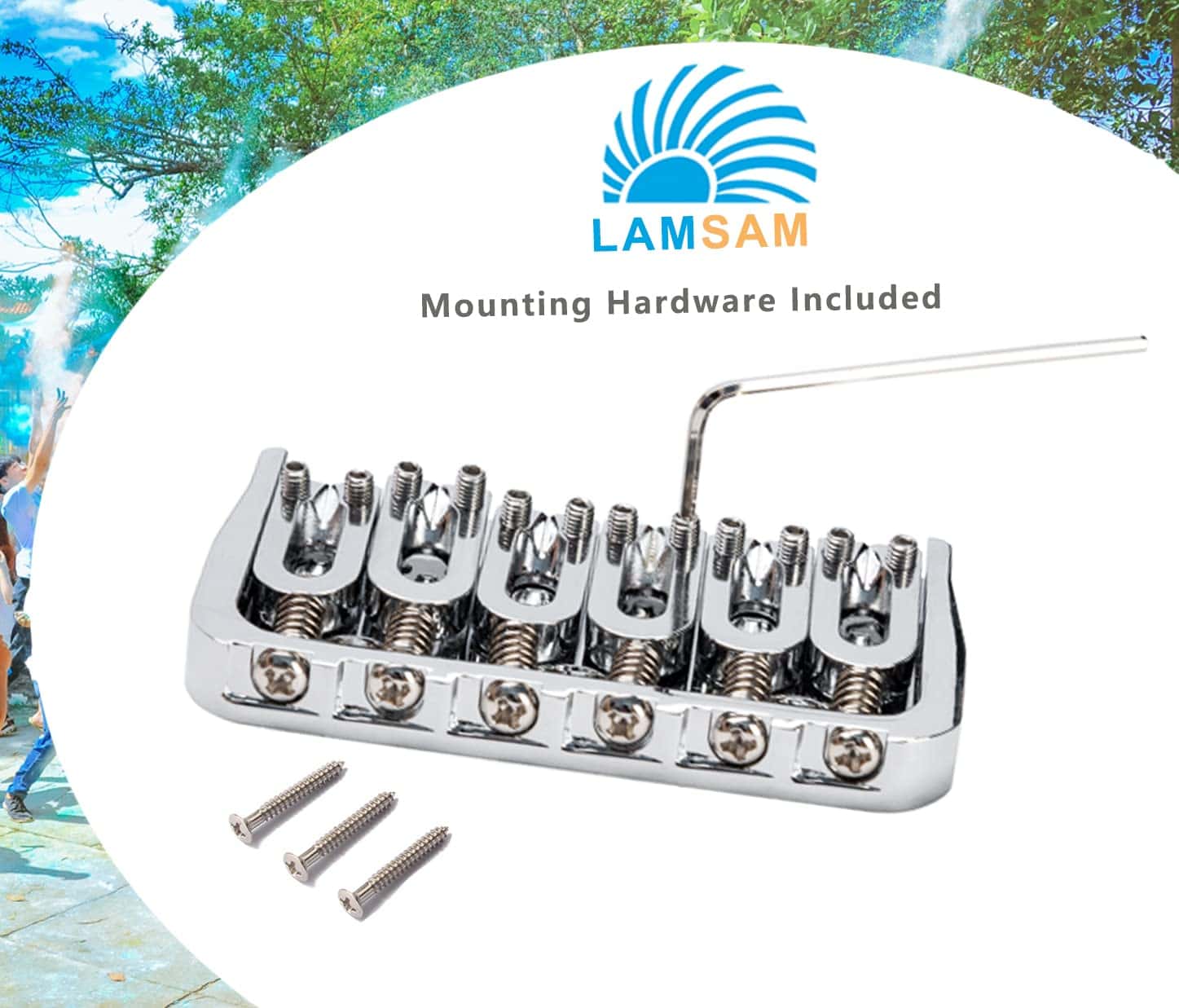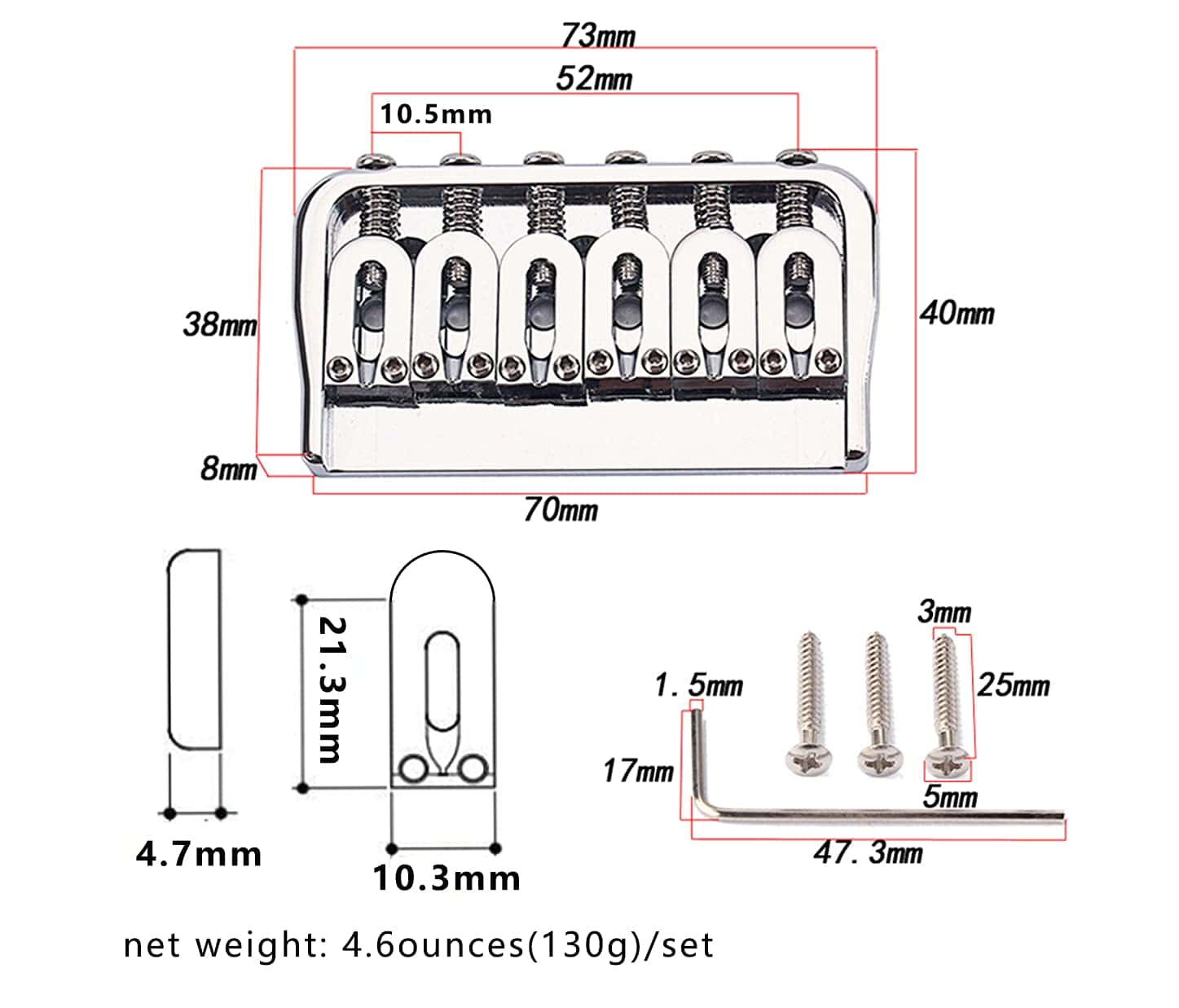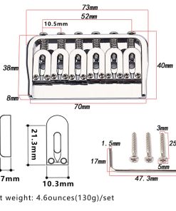 Características: Este puente fijo LAMSAM es un diseño de cuerdas que pasan por el cuerpo. Fácil de conectar a tierra el puente a la electrónica muy SÓLIDO con sillas de latón suave, bien hecho y pesado. tres tornillos de fijación en este puente duro. Esto funcionaría muy bien como repuesto o mejora para una Strat o Tele rígida. tiene una buena cantidad de ajuste para configurar la entonación y la entonación de la silla se puede ajustar individualmente. Dimensiones: Aproximadamente 73mm x 40mm Espaciado de cuerdas: 10.5mm por favor permita alrededor de 1mm de tolerancia para la medición manual Material: silla de latón, placa base de zinc Color: cromo Paquete: 1 x puente fijo 1 x llave allen 3 x tornillos de montaje