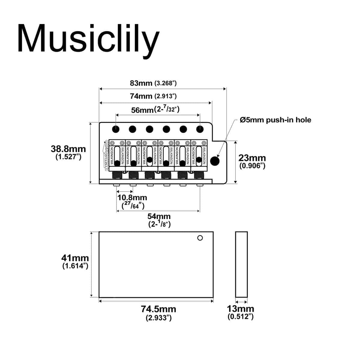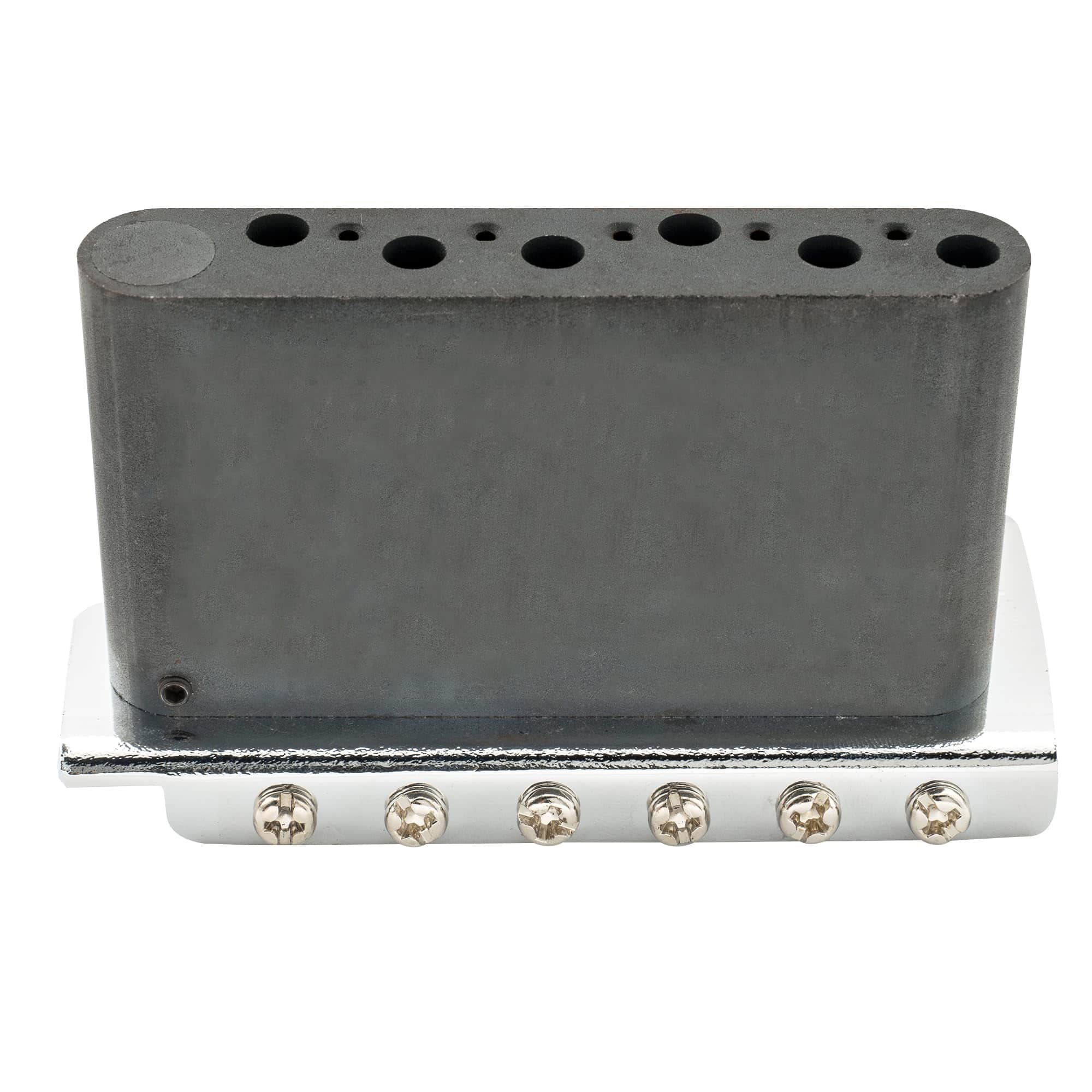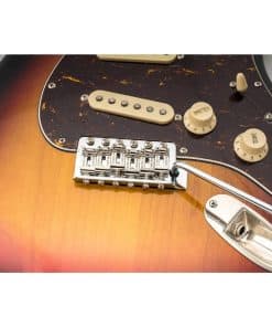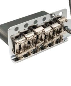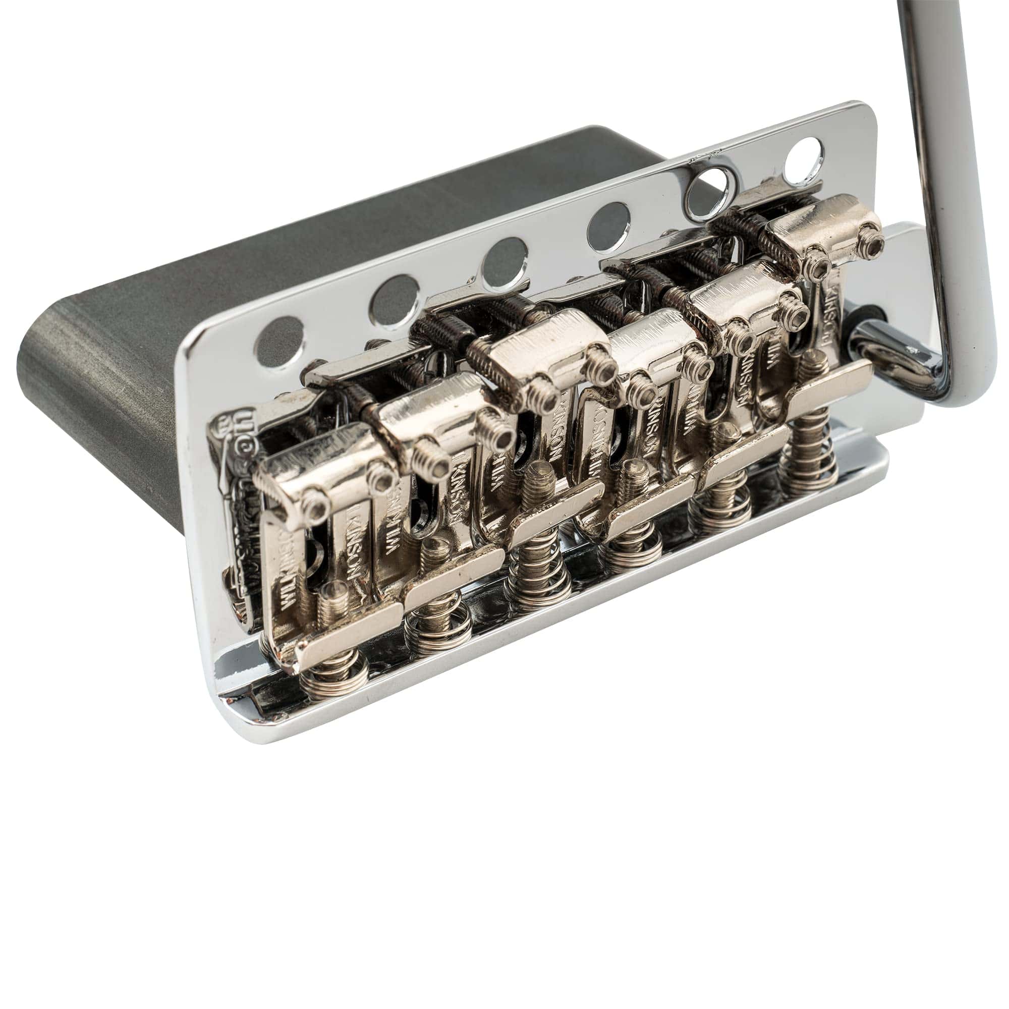 Puente Tremolo Vintage Wilkinson de 54 mm con Bloque de Acero para Stratocaster Americanas Vintage y Stratocaster Japonesas, Cromado. Este puente tremolo está diseñado para adaptarse a una variedad de modelos de guitarras Stratocaster, como Americanas vintage y japonesas. Cuenta con selletas de acero vintage con el sello de Wilkinson para una excelente calidad. El bloque de acero completo proporciona una mayor estabilidad y sustain. Los orificios escalonados en el bloque de sustain permiten una mejor entonación y afinación de las cuerdas. Además, el brazo de tremolo de inserción facilita la instalación. Incluye un juego de puente y todos los accesorios necesarios para el montaje. Perfecto para aquellos que buscan mejorar el rendimiento y la estabilidad de su guitarra Stratocaster.