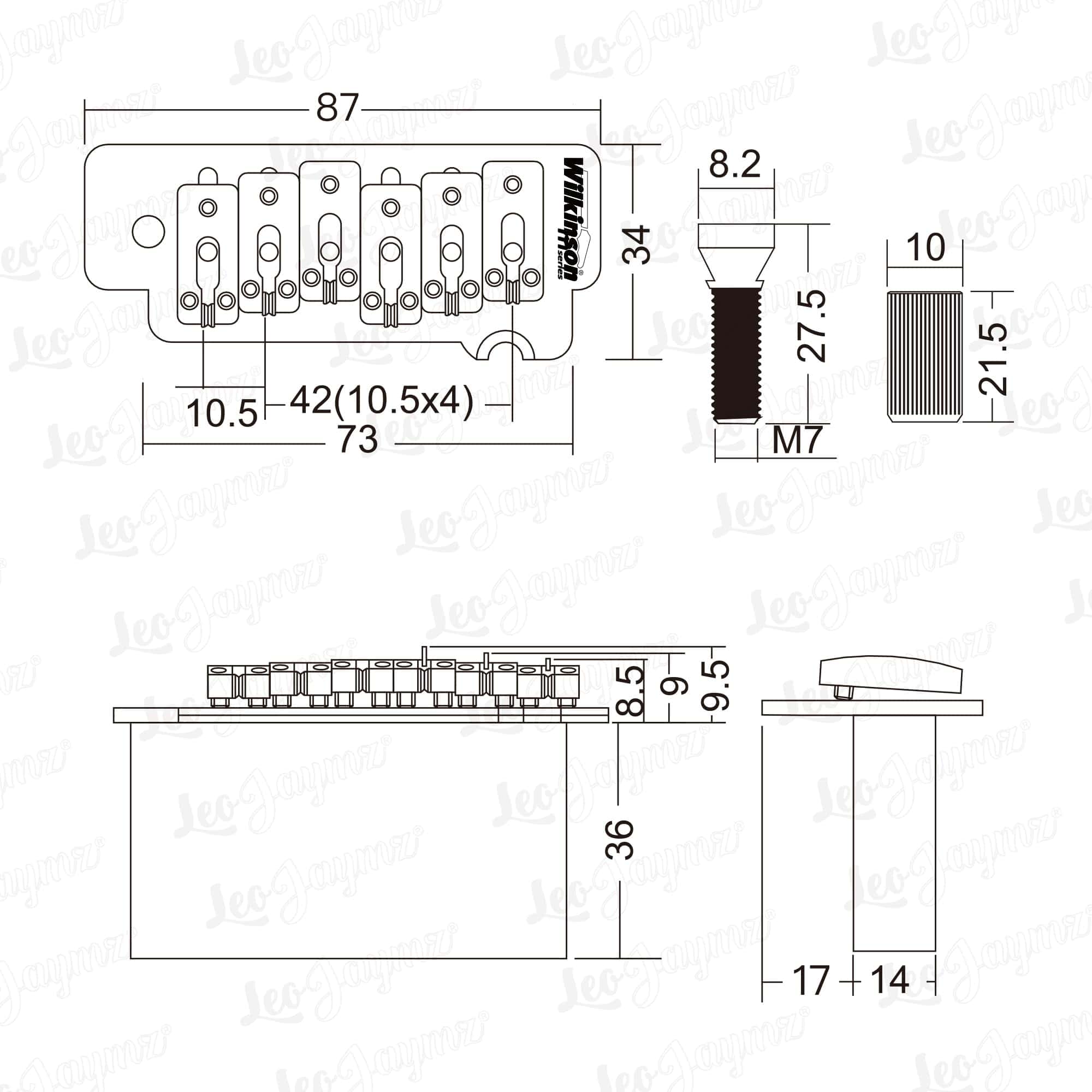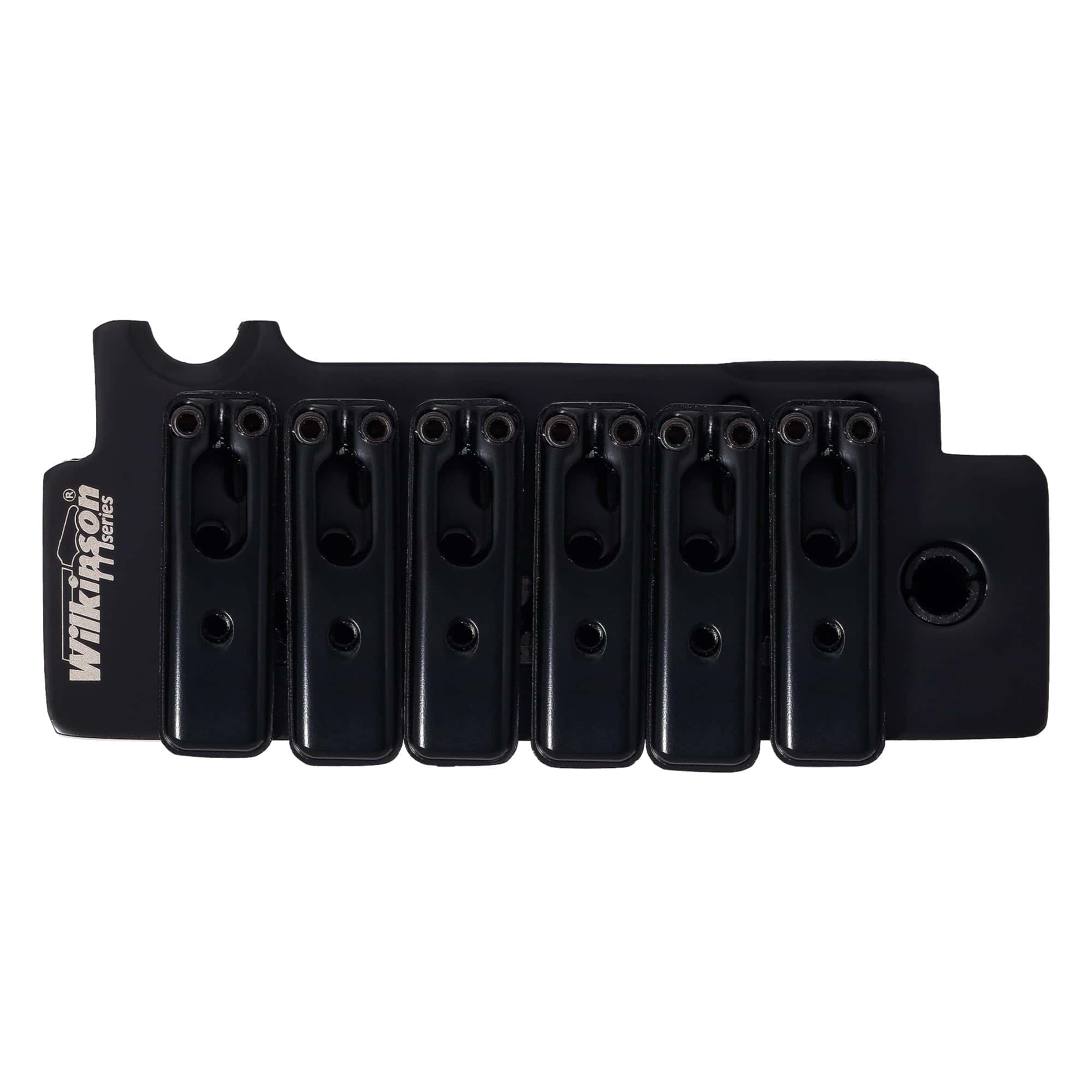 El Puente Tremolo Wilkinson WOV10 de 2-1/16 pulgadas es un puente universal adecuado para casi todas las guitarras ST modernas, como Squier Strats, Mexican Strats, American Standard/Professional Strats (1987-presente), MIJ/MIK ST guitars. El espaciado de cuerdas es de 10.5×5 52.5mm (2-1/16 pulgadas); espaciado de pernos: 54-63mm (2-1/8 a 2-7/32 pulgadas), 2 pernos, puede adaptarse a una variedad de espaciados de pernos. Las selletas pulidas garantizan un movimiento suave de las cuerdas y flexiones sin esfuerzo. El bloque corto completo (13mm de grosor, 36mm de profundidad) optimiza la vibración y resonancia de las cuerdas, mientras que las selletas individuales mejoran la estabilidad de la afinación y el sustain. La instalación es sencilla con el brazo tremolo push-in.