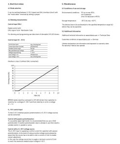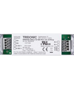 Puente para convertir señales analógicas o digitales DALI / DALI-2 en PLC para atenuación de cadenas de CC. Nota: Debido a la tecnología PLC, el puente solo funciona con controladores LED de cadenas de CC de 48 V de Tridonic (en combinación con placas DC 48 V LMI). No se garantiza un funcionamiento sin errores con controladores de 48 V de otros fabricantes. Para conectar controladores LED DC-String LMI atenuables en sistemas de control 0-10 V o DALI. En condiciones de entrega, 0-10 V está activo (para más detalles, consulte el capítulo 4.1 de la hoja de datos). Para un máximo de 20 controladores LED DC-String LMI / direcciones. Encendido / apagado a través del controlador DC-STR UNV FO Driver 0-10V o DALI. Para la funcionalidad de atenuación de grupo mediante el uso de atenuadores estándar 0-10V o atenuación individual utilizando un dispositivo de control DALI Clase 2. Carcasa: policarbonato, blanco. Datos Técnicos Rango de voltaje nominal: CC 45-54 V Corriente nominal (a 48 V CC): <30 mA Consumo de energía: <1.5 W Ciclos de encendido / apagado: 50,000 Temperatura ambiente: ta (a 50,000 h de vida útil) -25 a +60 C Temperatura máxima de la carcasa: tc 65 C Dimensiones L x W x H: 4.72 x 1.18 x 0.83 pulgadas Peso: 0.83 libras Entrada de Control (0-10 V) Control de entrada abierta: nivel de atenuación máximo Control de entrada en cortocircuito: apagado (en espera) Rango de corriente de interfaz: 540 A Voltaje de entrada permitido máximo: 13 V Rango de voltaje de atenuación: 1-10 V Voltaje de entrada <1 V: apagado (en espera) Voltaje de entrada > 10 V: nivel de atenuación máximo Documentos: Datasheet