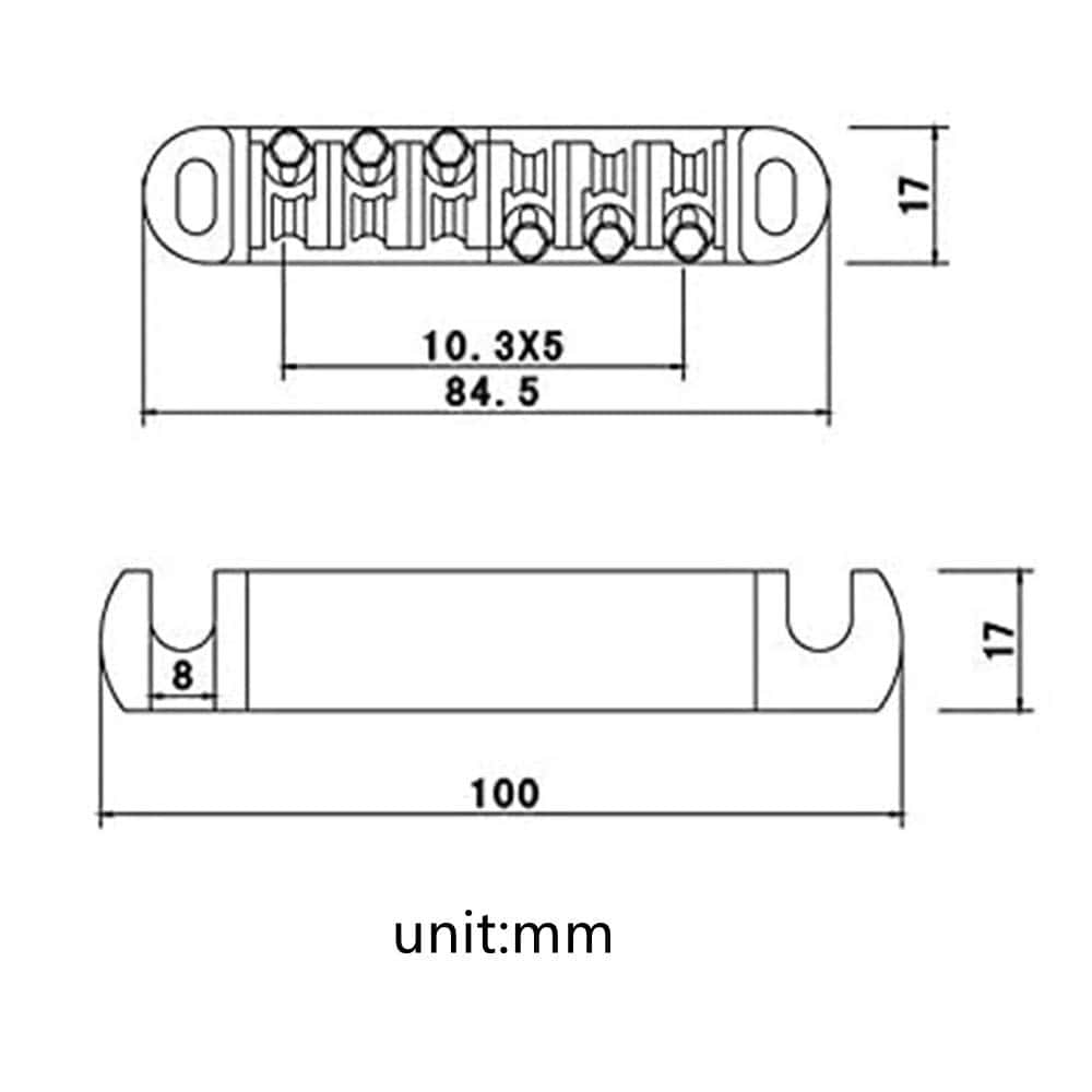 Las piezas y los hilos son de tamaño métrico. La separación de los postes es estándar. Se ajusta perfectamente a una Gibson SG. El puente con rodillos de silla de montar y la cola se ajustan a guitarras eléctricas Gibson/Epiphone Les Paul, etc. Tamaño de la cola: Ancho (17 mm) Longitud (98 mm). Espaciado entre 2 postes de la cola (82 mm de centro a centro). Tamaño del puente: Ancho (17 mm) Longitud (84,5 mm). Espaciado de cuerdas: 10,3 mm. Sillines totalmente ajustables para armónicos, con rodillos suaves. Completo con postes de bloqueo. Incluye: 1 puente con rodillos de silla de montar y 2 postes 1 cola y 2 postes a juego.