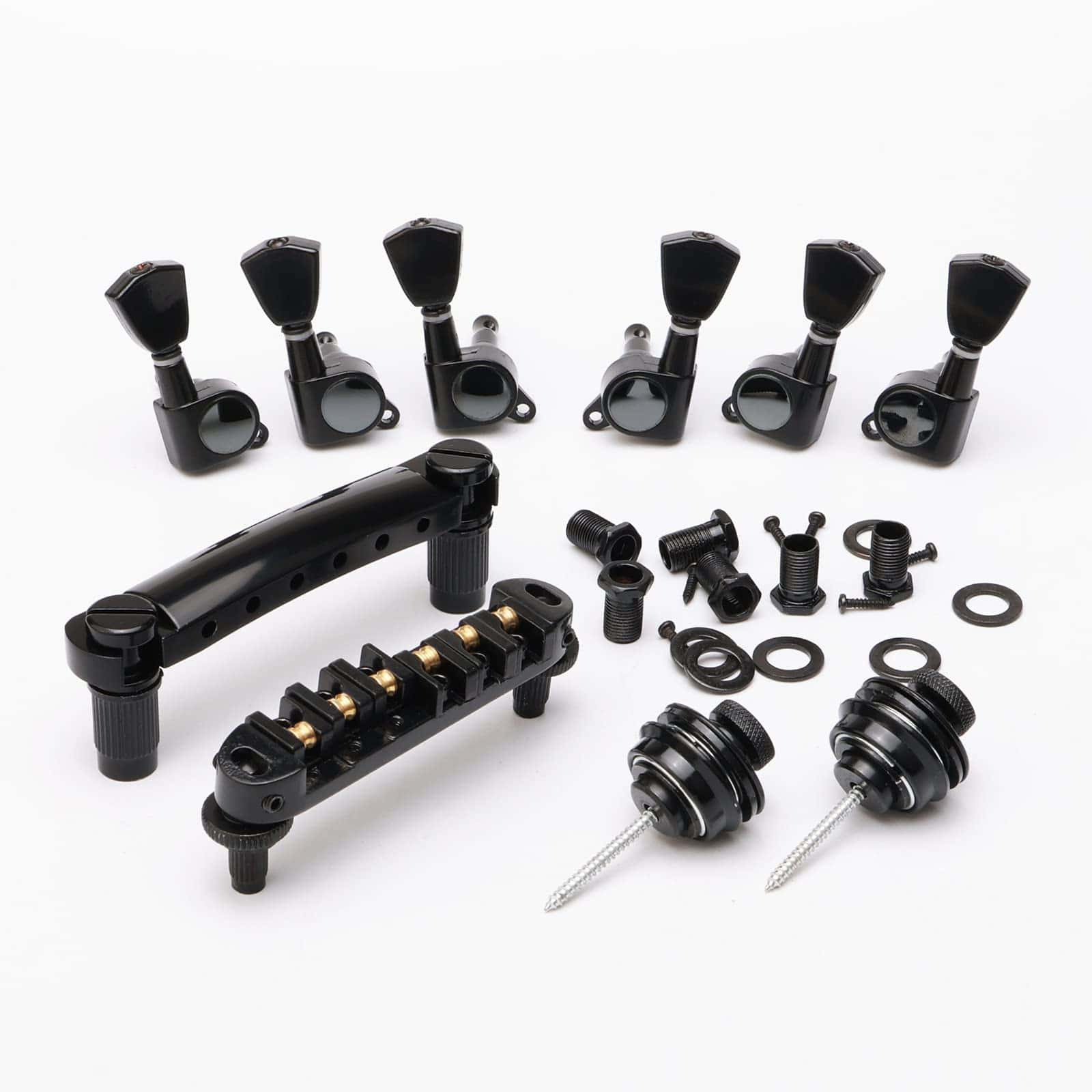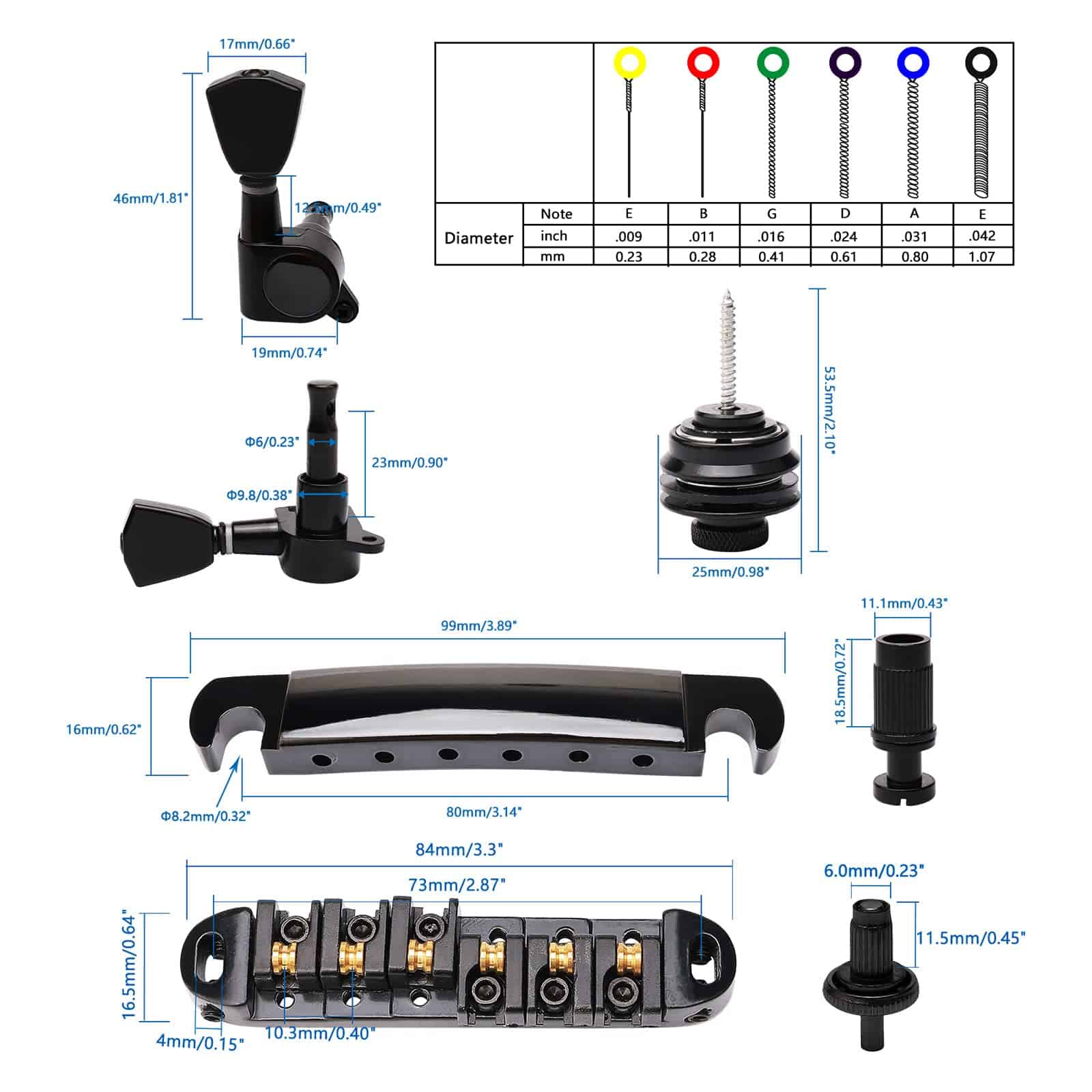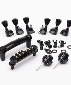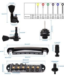 1 puente de sillín y 2 espárragos 1 cola y 2 espárragos a juego 2 hebillas de correa 6 cuerdas de guitarra 1 tensor y cortador de cuerdas de guitarra 1 destornillador Phillips 1 llave