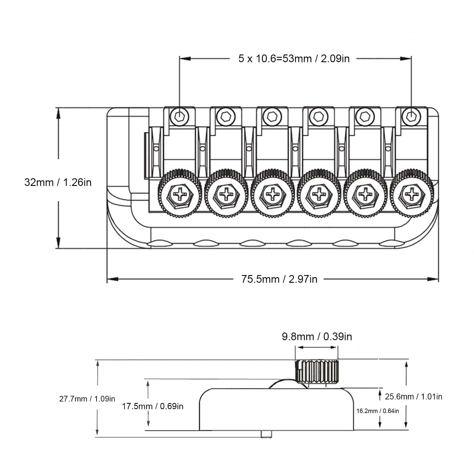 Puente y cordal de guitarra sin cabeza, 6 cuerdas con