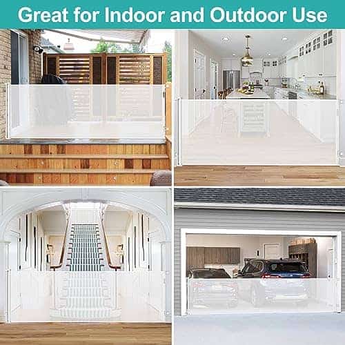3. Puerta Retráctil de 95″ Extra Ancha: la puerta retráctil extra ancha para perros es lo suficientemente ancha y alta para que no haya espacio entre la puerta y el suelo, y los niños y perros no puedan pasar por debajo de la puerta retráctil extra ancha para mascotas.