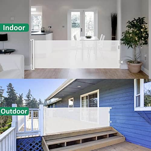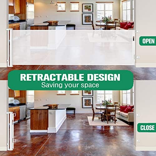 1. Puerta de bebé extra ancha de 122 pulgadas: Las puertas de bebé KISKIZ se ajustan a aberturas grandes de hasta 122 pulgadas de ancho y 33 pulgadas de alto. La puerta de bebé retráctil se puede ajustar en longitud para adaptarse a su apertura y se puede utilizar como puerta de bebé y puerta para mascotas.