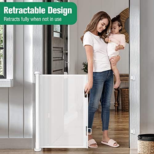 2. Diseño retráctil – Ahorra espacio y sin riesgo de tropezar: Estas amplias puertas de bebé retráctiles son ideales para áreas de mucho tránsito. Cuando no esté en uso, se puede retraer por completo, ocupando un espacio mínimo. Además, su diseño sin barra inferior garantiza que no haya riesgo de tropezar.