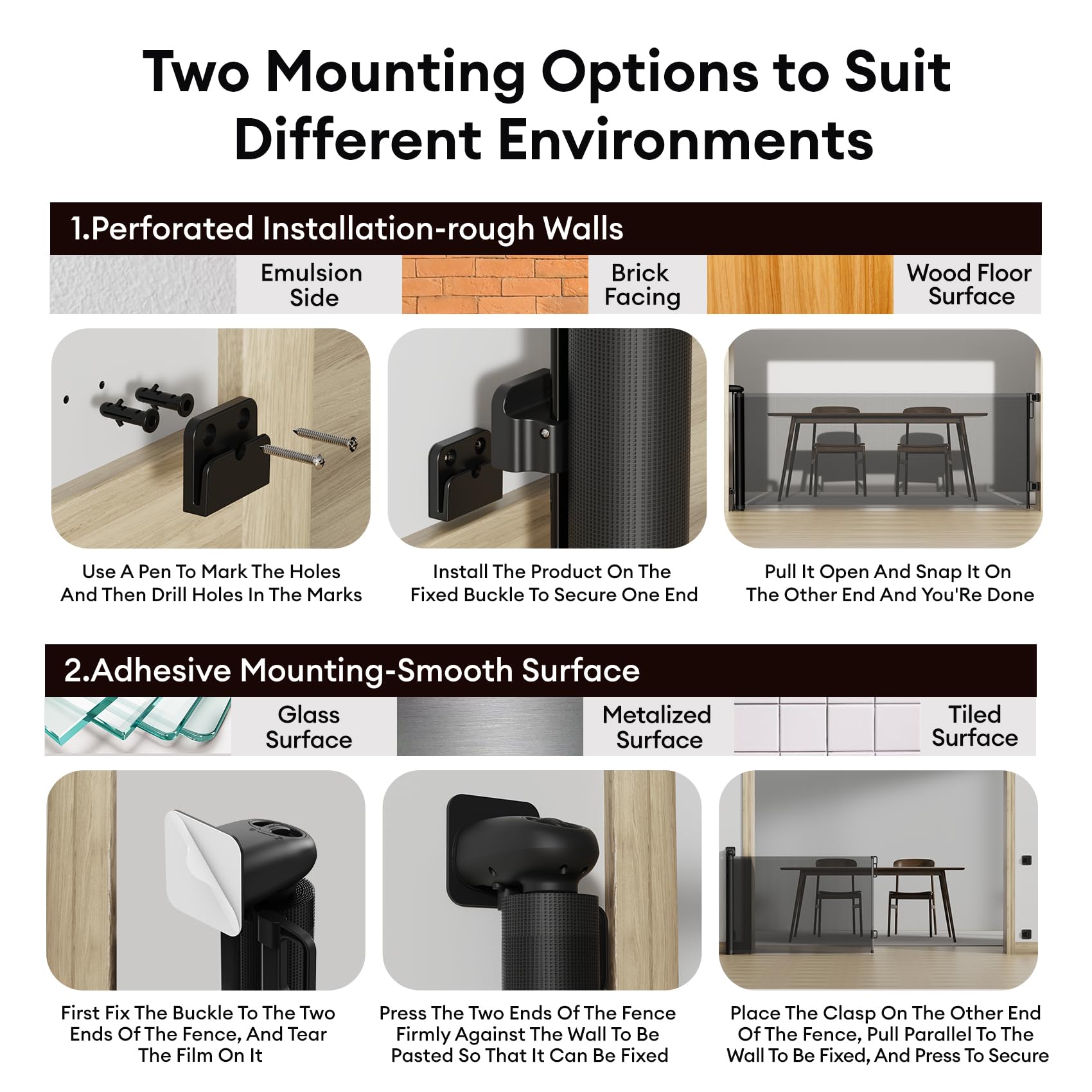 La Puerta de Bebé Retráctil Darella de 118 Pulgadas es perfecta para padres ocupados y cuidadores, ya que está diseñada para un fácil acceso, permitiendo abrir y cerrarla con una sola mano. Equipada con un mecanismo de bloqueo de seguridad para brindar tranquilidad al mantener seguros a los pequeños y mascotas. Ofrece opciones de instalación perforadas y pegadas para una fácil configuración sin necesidad de herramientas complejas. Fabricada en PVC y disponible en diferentes tamaños para adaptarse a cualquier espacio, garantizando máxima seguridad y comodidad. Apta para uso en interiores y exteriores, ya sea como puerta para perros o puerta para bebés, nuestro producto satisface todas las necesidades con un equipo de servicio al cliente dedicado para brindar asistencia en cualquier consulta o soporte que pueda necesitar.