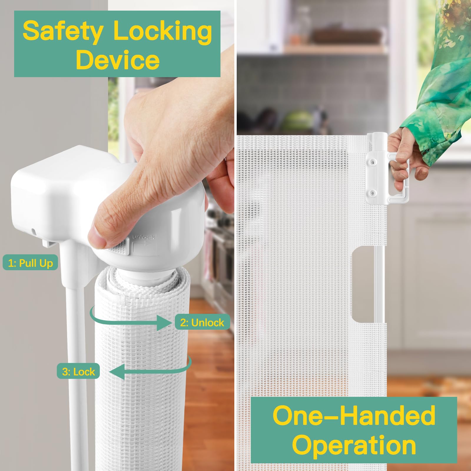 5. Malla Resistente – La malla de la puerta retráctil para escaleras es suave, asegurando la seguridad durante la hora de juego y evitando lesiones a niños o mascotas a causa de colisiones. Además, es lo suficientemente resistente como para soportar los arañazos de su mascota sin daños.