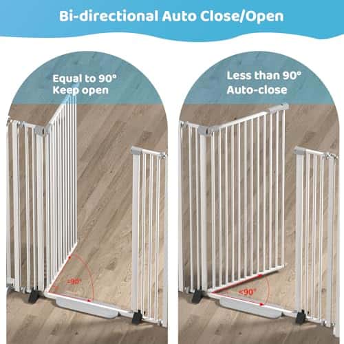 La puerta de gato extra alta de Uuoeebb para puertas tiene una altura adicional de 51,18 pulgadas, que puede bloquear eficazmente mascotas más grandes o evitar que los gatos salten a áreas fuera de la puerta. También puede prevenir que los niños se suban por encima de las puertas para gatos. Las puertas de mascotas de alta calidad le permiten colocar de manera segura sus mascotas en las áreas que desea y permitirles el paso en los momentos deseados. La puerta para mascotas extra alta está hecha de acero de alta calidad + ABS y mano de obra profesional, lo que la hace resistente y duradera, brindándole seguridad a largo plazo y tranquilidad. El cuerpo de riel de la puerta de gato para pasillos está disponible en un ancho de 28,3″ y viene con extensiones de 2,75″/7cm y 5,5″/14cm, lo que la hace perfecta para varios anchos de puertas, escaleras y espacios de cocina. Por favor, mida el ancho de la puerta antes de comprar. El diseño actualizado y mejorado de las publicaciones de la puerta para gatos de ultra estrecha reduce aún más la brecha entre las publicaciones de la puerta para gatos a 1,37 pulgadas, preveniendo eficazmente que las mascotas y los niños salgan de la brecha o queden atascados, evitando lesiones. El paquete también incluye dos barras de cifrado para reducir las brechas en el área de expansión. La estructura de doble cierre requiere que tire del candado y lo levante al mismo tiempo para abrirlo, haciendo que la puerta para gatos de doble cierre sea efectiva para evitar que las mascotas o los bebés abran accidentalmente la reja. La puerta para gatos para puertas sin perforación está equipada con 4 pernos de compresión ajustables, lo que le permite instalarla fácilmente sin utilizar herramientas o perforar agujeros en la pared. Es seguro y no dañará la casa ni la pared. Las almohadillas antideslizantes extra reforzadas protegen mejor la pared y evitan resbalones después de la instalación, haciendo que la puerta a prueba de gatos sea sólida. Por favor, no corte la brida antes de instalar la puerta para gatos extra alta. El color blanco y el diseño streamlined de la puerta para mascotas extra alta de gatos la convierten en una adición elegante a cualquier decoración de hogar. Los pedales antipatadas evitan golpes e lesiones en los pies al viajar con poca luz por la noche, y facilitan el paso del robot aspirador. La función de cierre automático de 90 de la cerca para gatos proporciona más comodidad y seguridad para usted y sus mascotas