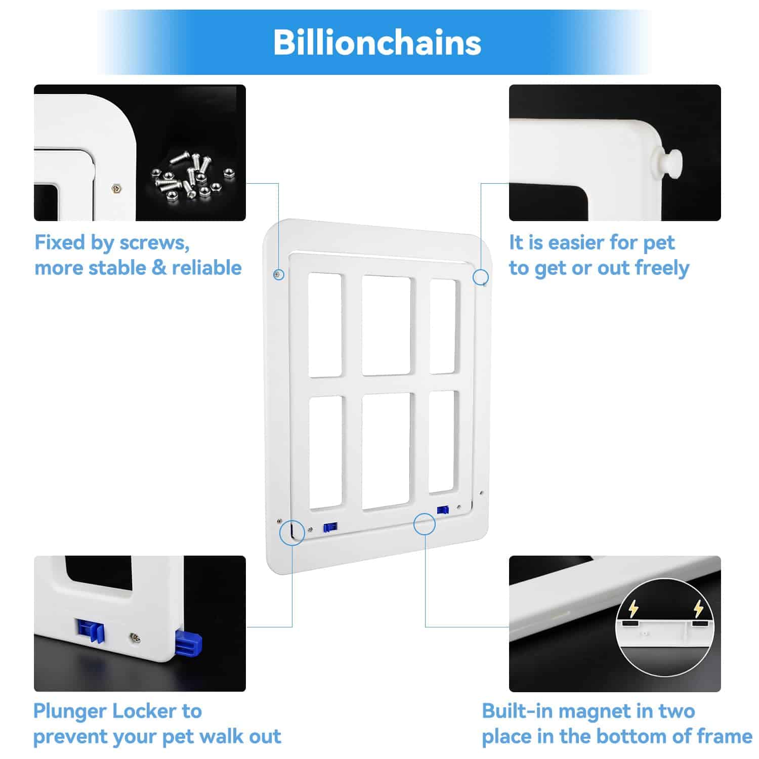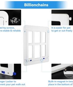 1. Alta Calidad: Puerta de pantalla para mascotas de Billionchains fabricada con material ABS premium, resistente y duradero. No se romperá o deformará fácilmente en condiciones climáticas extremas. La apariencia clásica es adecuada para casi todas las puertas o ventanas de pantalla.