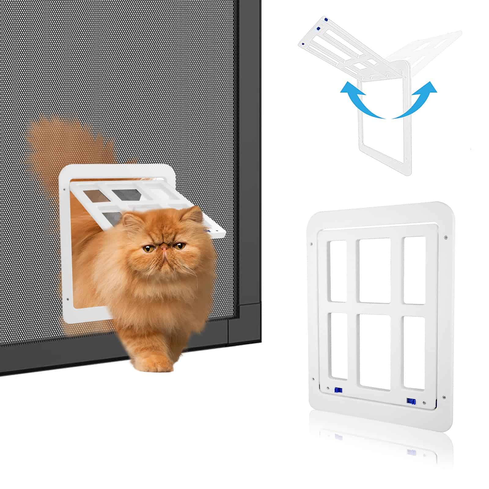 3. Cierre Automático y Bloqueable: Un imán en el marco inferior mantiene la solapa interior hacia atrás cuando se empuja. Dos cerraduras azules deslizantes para controlar la puerta en estado abierto o cerrado. También puede limitar a su mascota peluda en el interior.