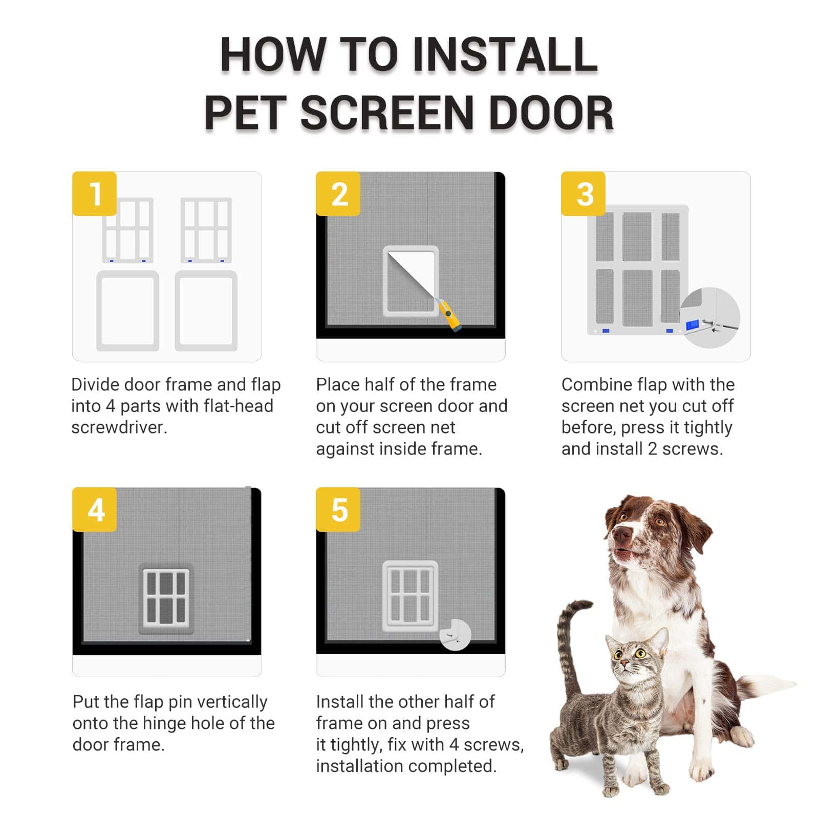 5. Información sobre el Tamaño: tamaño exterior: 9.8″ x 12.4″; tamaño interior: 8.2″ x 9.6″, debe instalarse según la altura de la mascota, apta para la mayoría de razas de gatos y perros pequeños. En el primer uso, necesitará entrenarlos para que pasen por la puerta de pantalla con premios.