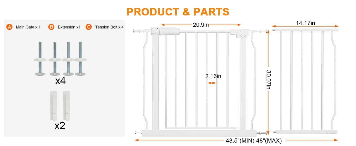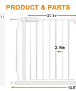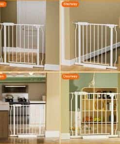 «Diseño Montado: Nuestras puertas de seguridad para bebés utilizan un sistema de doble bloqueo para limitar el acceso de niños o mascotas y mantenerlos seguros. Los adultos pueden levantar fácilmente el mango con una mano pero es difícil para los niños. Esta puerta para bebés se cerrará automáticamente cuando se suelte el mango. El diseño de doble cara le permite abrir en cualquier dirección. Tiene una altura de 30 pulgadas. La distancia de 2 pulgadas entre las barras verticales puede evitar que sus bebés y mascotas se salgan o se les quede la cabeza atascada. Variedad de Opciones de Ancho: Nuestra puerta de seguridad para bebés tiene varios anchos para elegir: Diferentes tamaños con paneles de extensión diferentes, todos los tamaños se pueden ajustar fácilmente, se adapta a espacios pequeños o anchos de 24 a 81 pulgadas. Por favor, mida sus aberturas cuidadosamente antes de comprar. Características de la Puerta de Seguridad para Niños HOOEN: Puerta ancha oscilante que permite a los adultos pasar fácilmente. Se adapta a aberturas estrechas y anchas entre 24 y 81 pulgadas. De doble cara y auto-cierre. Operación con una mano con función de presionar y levantar. Instalación fácil de presión montada sin herramientas para proteger la pared. Construcción de metal resistente y pesada. Instalación Fácil: Esta puerta de bebé montada con presión es súper fácil y rápida de instalar y quitar. Lo único que necesita hacer es ajustar los 4 postes de manera independiente en la pared. Si elige el tamaño con paneles de extensión, es muy simple agregarlos. Solo use los tornillos que aseguran la puerta en el extremo exterior de la extensión y póngalos en la puerta hasta que estén bien apretados. MULTIFUNCIONES: Adecuado para escaleras, pasillos, puertas, cocinas, salas de estar y cualquier espacio abierto al aire libre.»