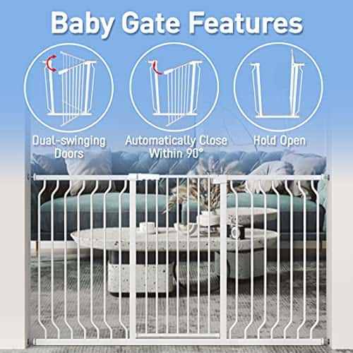 Puerta de seguridad extra alta para bebés de 40.55″ con ancho de 29.53″-32.68″ Montada a Presión con Apertura de Paso Oscilante Cierre Automático de Metal Blanco para Niños Pequeños Perros Mascotas para Escaleras Interiores, Puertas, Cocina. Puerta de bebé para mascotas extra grande y alta con apertura de 180° de dos vías que te permite abrir en ambas direcciones para una entrada y salida fácil. Se cierra automáticamente cuando se suelta la manija, permite abrir desde ambos lados. Puerta de perro de metal blanco o negro duradera y segura hecha de tubo de doble acero al carbono espeso, marco exterior de acero con un grosor de 0.047″, diámetro del tubo redondo reforzado con un grosor de 0.47″. La separación entre los tubos redondos es solo de 1.97″, por lo que también es una opción perfecta como puerta para mascotas, que puede restringir eficazmente la entrada y salida de las mascotas. Después de las pruebas manuales, la puerta de seguridad para bebés puede resistir 180 libras de fuerza. Multiuso, ajustable de 29.53″ a 76.77″, ideal para escaleras, puertas y pasillos para detener que bebés, niños o mascotas se trepen. Consejos: por favor, mide el tamaño de la abertura antes de comprar para garantizar un ajuste adecuado. Sistema de doble bloqueo con opción de apertura con un botón para adultos y difícil para los niños, garantiza una instalación segura. Fácil de instalar con 4 pernos de presión ajustables, sin herramientas ni daños en las paredes de tu casa. Si tienes problemas durante la instalación, no dudes en contactarnos.