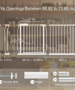 2. Puerta de bebé ajustable: Puertas para bebés y perros de 30,5 pulgadas de alto, se expanden para adaptarse a aberturas de 66,92-71,65 pulgadas de ancho. La puerta de 21 pulgadas hace que las madres puedan pasar más fácilmente mientras sostienen a un bebé. Asegúrese de medir su abertura antes de comprar para garantizar un ajuste adecuado.
