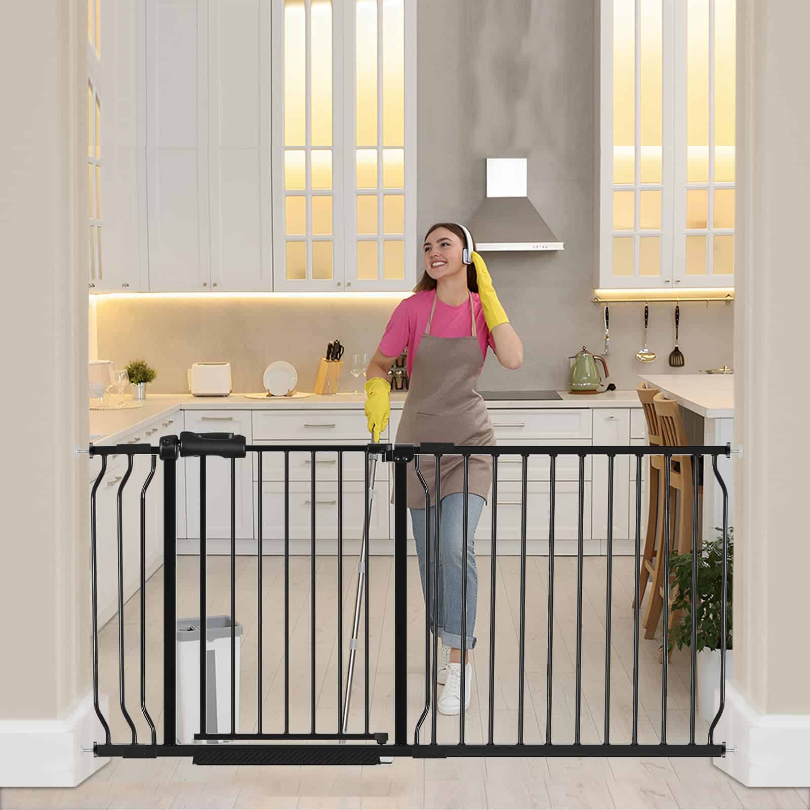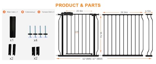 1. Ancho Ajustable Puerta de seguridad extra ancha HOOOEN montada a presión para pasillos con puerta que presenta un diseño rectangular, con altura de 30 pulgadas y ancho ajustable de 62-67 pulgadas que garantiza que su bebé o mascota esté lejos del peligro. 2. Puerta de Bebé Duradera y Segura Nuestra puerta de seguridad extra ancha para escaleras puede restringir efectivamente a su bebé o mascotas de ingresar a áreas específicas, asegurando su seguridad y brindándole a usted y su familia seguridad y tranquilidad. 3. Instalación Fácil La puerta de seguridad para bebés interior/exterior adopta el diseño montado a presión, que puede configurarse rápidamente sin necesidad de taladrar, lo que la convierte en una elección ideal para padres y dueños de mascotas. 4. Fácil de Usar Diseño de operación con una sola mano, los adultos pueden abrir fácilmente la puerta de bebé para escaleras con una mano, es fácil de abrir y cerrar. Perfecto para escaleras, pasillos o puertas, creando un entorno seguro para el crecimiento. 5. Múltiples Especificaciones Nuestras puertas de bebé grandes y largas para pasillos tienen diferentes especificaciones para que elija, adecuadas para varios anchos de habitaciones. Asegúrese de medir correctamente antes de comprar.