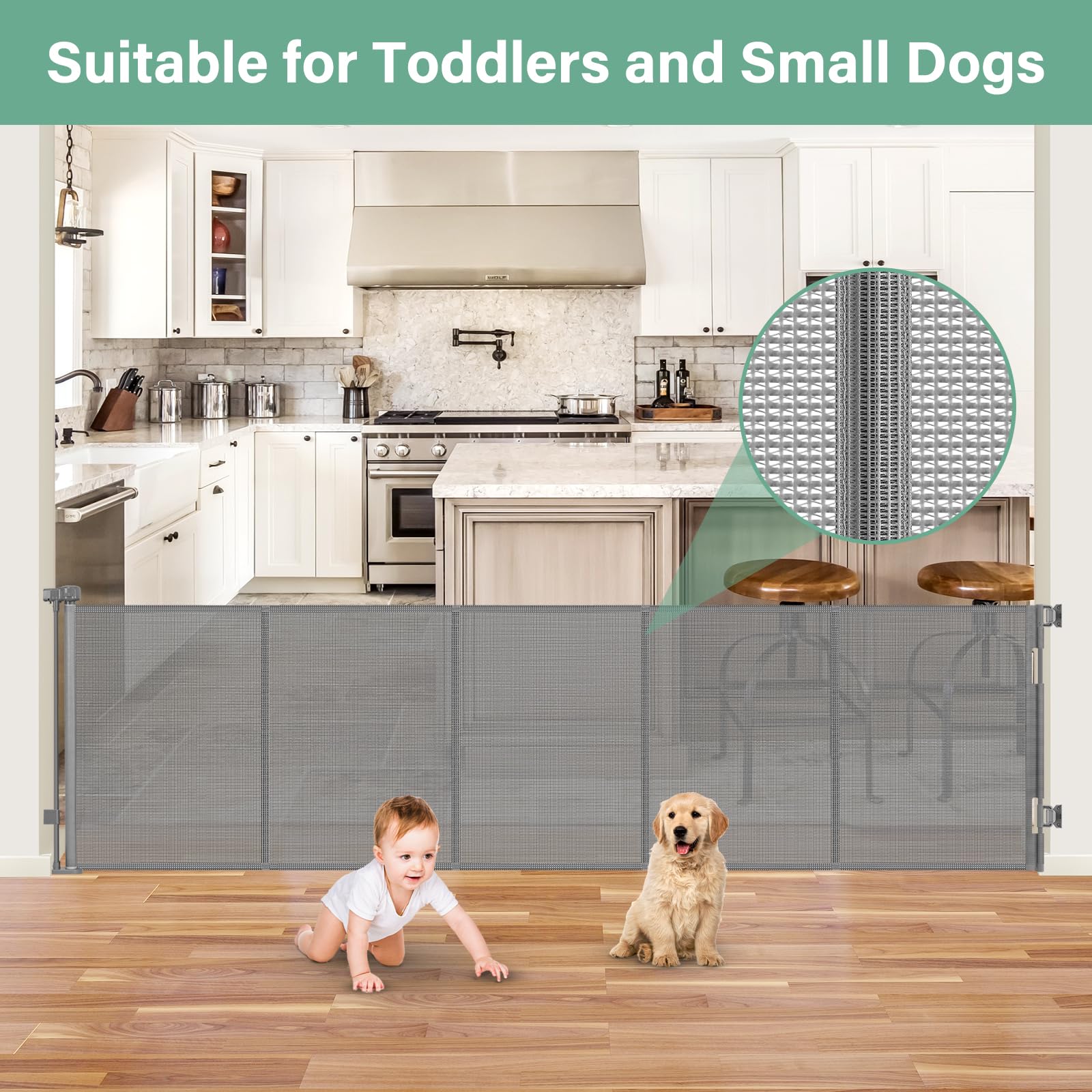 Puerta retractil de 26″ de altura para niños pequeños y perros pequeños. 26″ de altura para cruzar. Puerta retractil – Ahorro de espacio. Diseño de barra reforzada. Excelente para interiores y exteriores. Malla suave, resistente a los arañazos y antiescalada. Sin riesgos de tropiezos. Se adapta a zócalos. 26″ de altura para cruzar: la altura de la puerta retractil para perros es de 26 pulgadas. Los adultos pueden cruzar la puerta retractil para exteriores sin desbloquearla, pero los niños pequeños y las mascotas no pueden pasar por la puerta retractil para perros. Puerta retractil – Ahorro de espacio : la puerta retractil para bebes es retráctil y permite que la malla se enrolle completamente cuando no se usa, ahorrando espacio. La puerta de malla retractil es de 26″ de altura y se adapta a aberturas de 0-95″ de ancho. Diseño de barra reforzada: la malla tiene tiras de refuerzo incorporadas. 1. La malla no se hundirá ni arrugará. 2. No hay separación entre la puerta para perros pequeños y el suelo, y no se puede levantar por debajo de la puerta para perritos pequeños. 3. La puerta para perros pequeños se retrae suavemente y no se atascará. Apto para niños pequeños y perros pequeños : la malla de la puerta es suave, resistente a los arañazos y antideslizante, evitando que sus hijos suban la puerta y que las mascotas rasguen la puerta. Deje que sus niños y mascotas jueguen en un ambiente seguro. Excelente para interiores y exteriores: la puerta para animales puede utilizarse tanto en interiores como en exteriores en lugares como cocinas, pasillos, salas de estar, puertas delanteras, terrazas y más. Sin riesgos de tropiezos: a diferencia de la puerta metálica, no hay barra debajo de la puerta para animales y los niños no tropezarán con la barra al pasar por la puerta. Se adapta a zócalos : los accesorios de la puerta para cachorros pueden deslizarse hacia arriba y hacia abajo para evitar la instalación del zócalo. Puede instalar la puerta para perros en el zócalo de varios estilos y alturas.