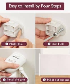 Puerta retráctil para bebés Momcozy, 33″ de altura, se extiende hasta 55″ de ancho, puertas de seguridad para bebés para escaleras, puertas, pasillos, interiores, exteriores. La puerta retráctil para bebés cuenta con un mecanismo de doble bloqueo que crea un hogar seguro para tus pequeños exploradores y los mantiene alejados del peligro, proporcionando un entorno seguro y cerrado para jugar. Esta puerta para perros se ajusta a aperturas de hasta 55″ de ancho y tiene 33″ de altura que se puede ajustar para adaptarse a tus necesidades. La malla se puede retraer por completo cuando no está en uso. Simplemente empuja y gira suavemente el botón para bloquear y desbloquear la puerta retráctil para bebés con una mano. La operación con una sola mano hace que sea muy conveniente de usar cuando estás cargando al bebé o llevando juguetes, pañales, por la casa. La puerta retráctil para bebés es la solución perfecta para puertas y escaleras para bloquear el paso a los bebés y mascotas que necesitan seguridad en toda la casa. La puerta para mascotas se utiliza para bloquear la entrada o salida de niños y mascotas. Con las herramientas proporcionadas, puedes instalar tu nueva puerta para niños en minutos. Obtendrás: Plantilla de instalación x1, Puerta de seguridad x1, Soportes de montaje superiores x2, Soportes de montaje inferiores x2, Gancho de montaje x4, Espaciadores de 10 mm x2, Espaciadores de 5 mm x2, Tornillos cortos x16, Tornillos largos x16, Anclajes de pared x20, Instrucciones x1. Todas las líneas de puertas para bebés se prueban según normas de seguridad, cumpliendo o superando las normas ASTM o EN.