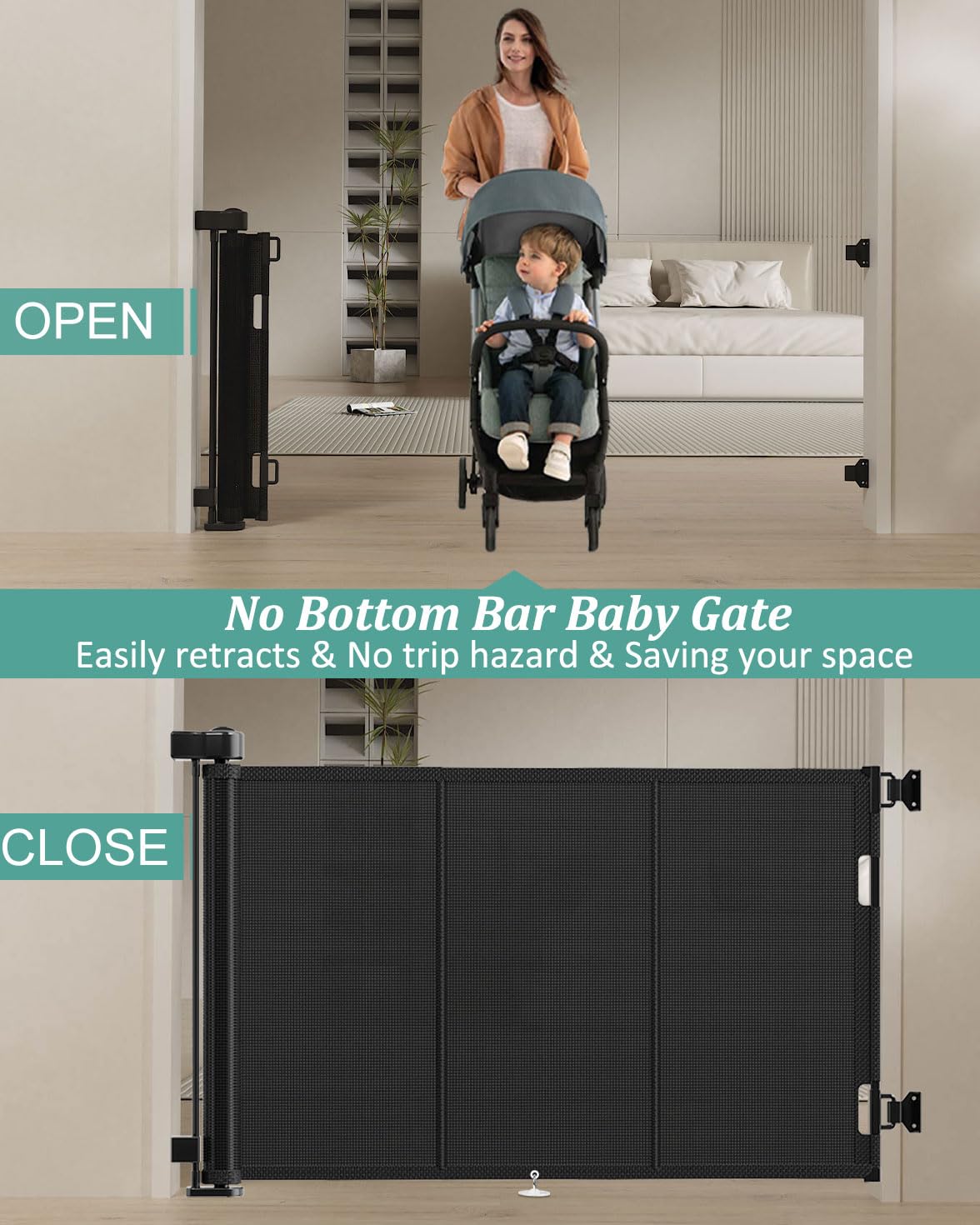 3. SUPER SEGURIDAD La puerta de bebé Miumoon utiliza materiales de seguridad innovadores, dando tranquilidad a las mamás al usarla para sus bebés. El material de la malla es más suave para los bebés, reduciendo las posibilidades de lesiones mientras juegan. La puerta retráctil de Miumoon no tiene barra inferior, por lo que no hay riesgo de tropiezos.
